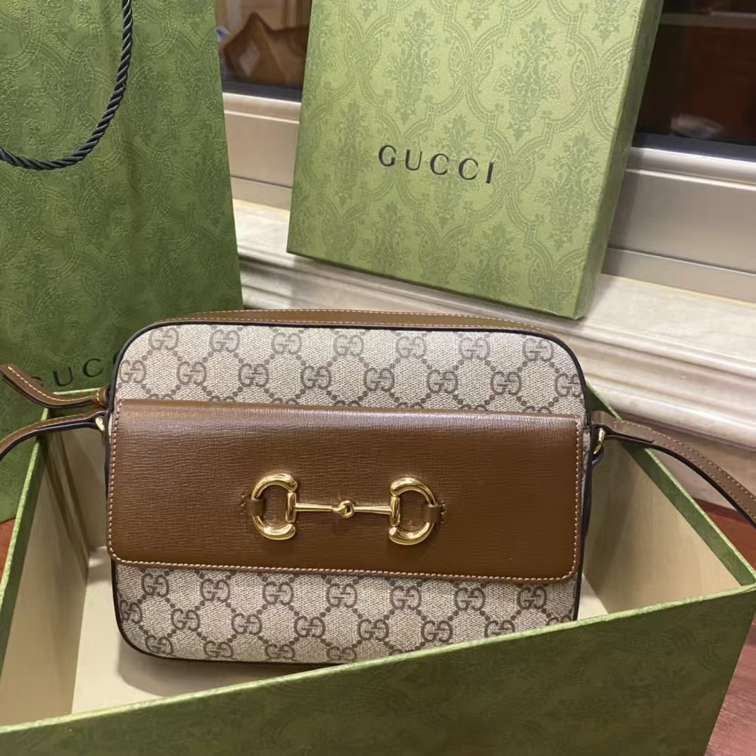 Gucci原厂皮,马衔扣已经成为品牌的象征之一。其别具一格的双环和长条形设计源自Gucci马术本源,现已成为品牌的设计传承之一。在Epilogue系列中,Gucci马衔扣1955系列匠心糅合六十余年前品牌初创的经典细节与现代时尚精髓,打造出这款米色和乌木色GG Supreme帆布材质的小号肩背包,饰以特别的可调节肩带设计,可在肩背或斜跨之间自由转换。米色/乌木色GG Supreme帆布,环保材料棕色皮革细节,金色调配件,麂皮质感超细纤维衬里。尺寸:长22.5~高17~ 6.5cm,型号:645454