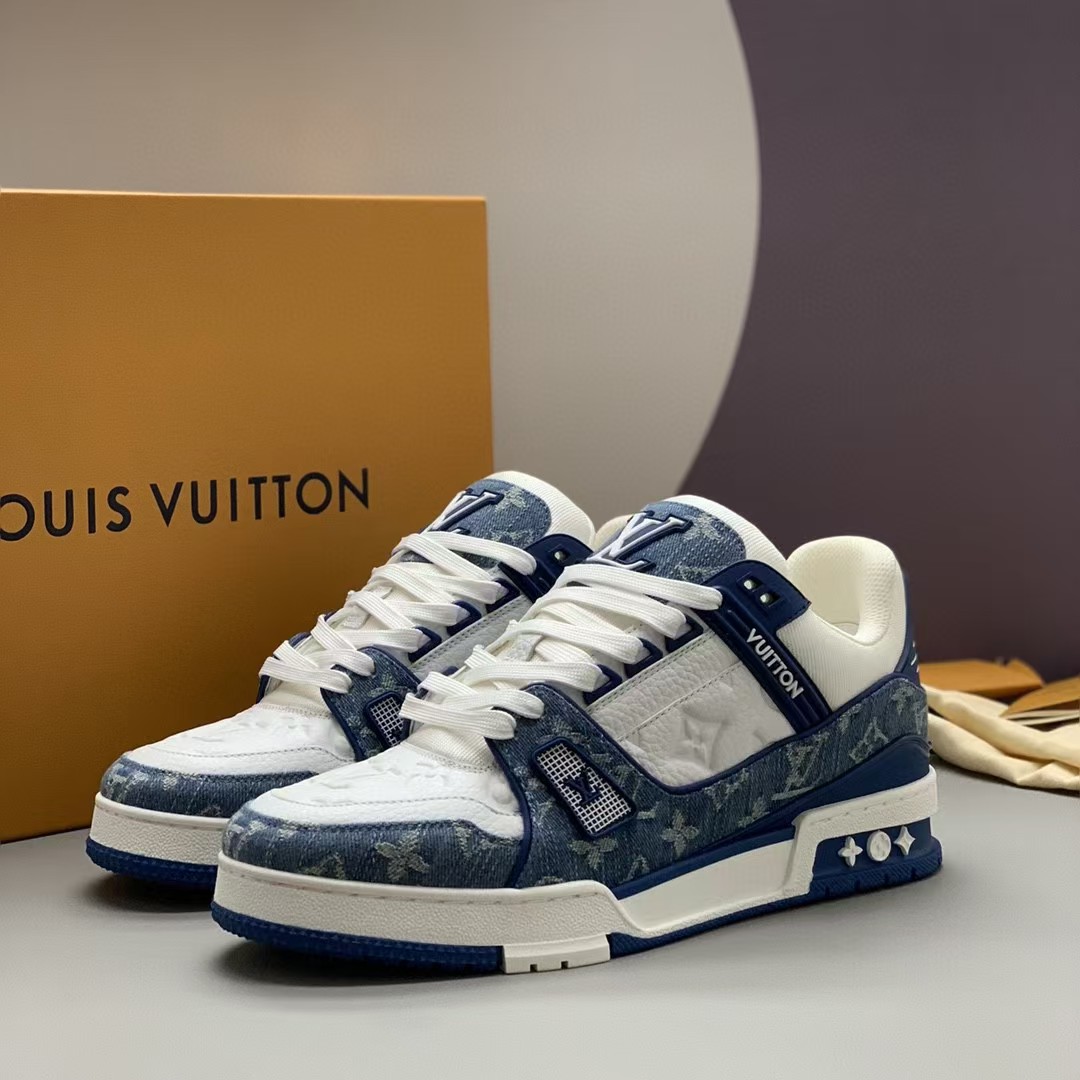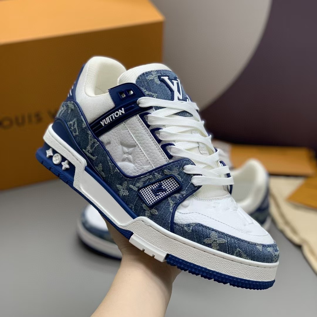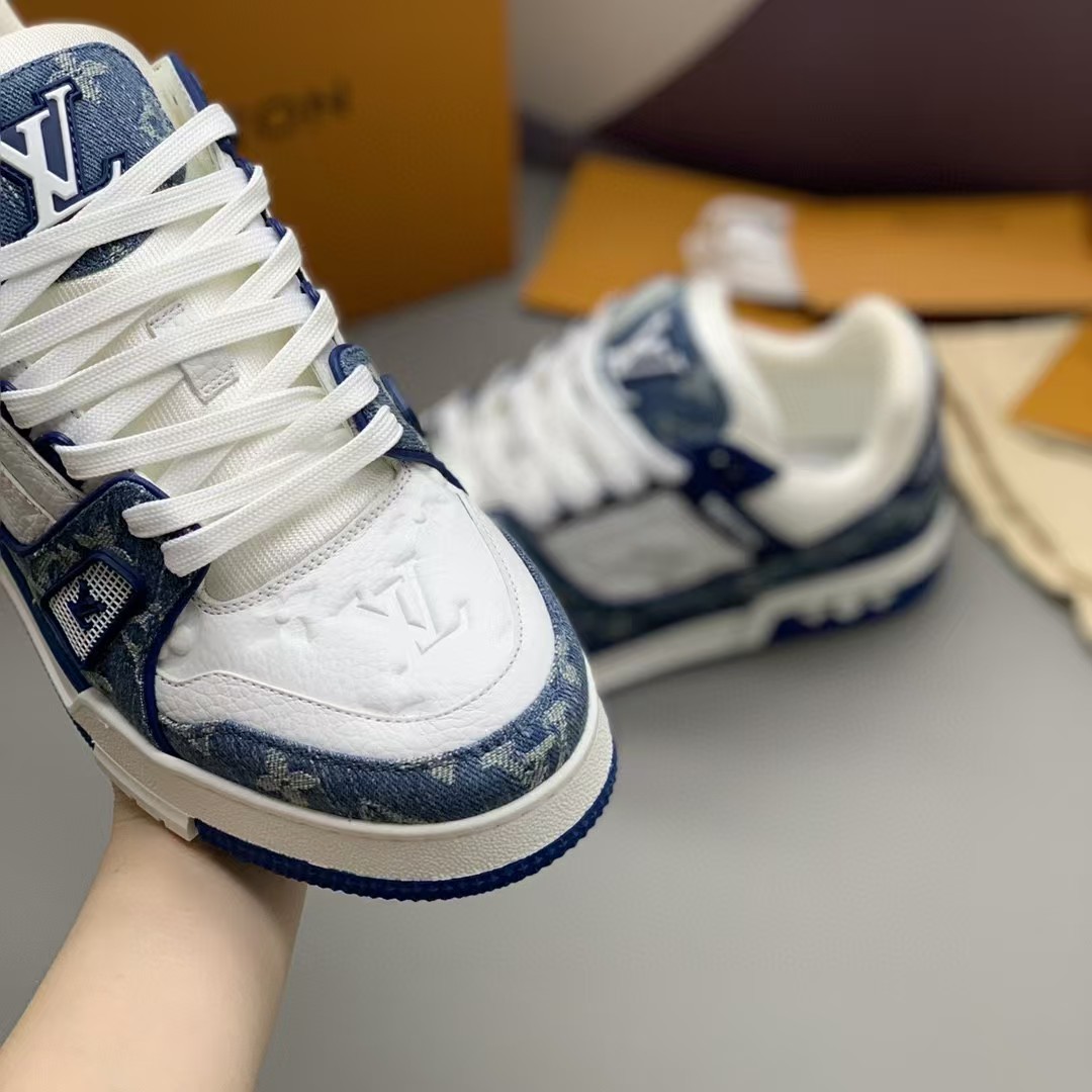 【介绍】情侣款运动跑鞋,此款运动鞋采用牛仔布拼接白色牛皮制成,设计简洁,侧面饰有其Vuitton 标识,科技橡胶外底、并延续创新凝胶外底带来的舒适感更为出众;鞋舌饰有 logo字母,外底饰有 Monogram 花卉