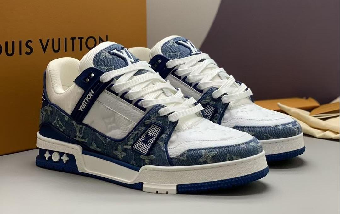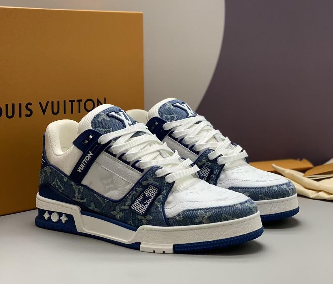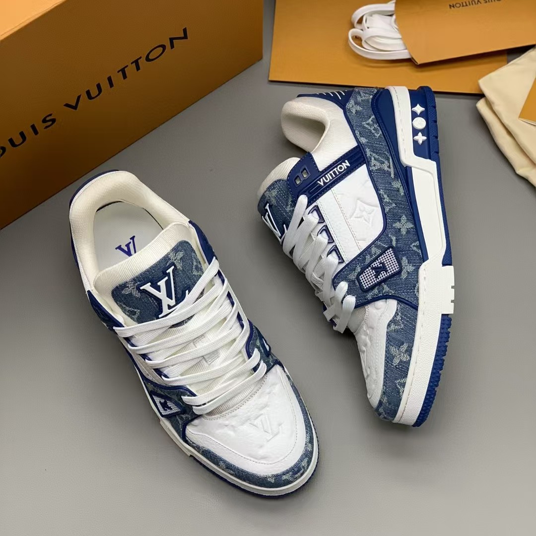【介绍】情侣款运动跑鞋,此款运动鞋采用牛仔布拼接白色牛皮制成,设计简洁,侧面饰有其Vuitton 标识,科技橡胶外底、并延续创新凝胶外底带来的舒适感更为出众;鞋舌饰有 logo字母,外底饰有 Monogram 花卉