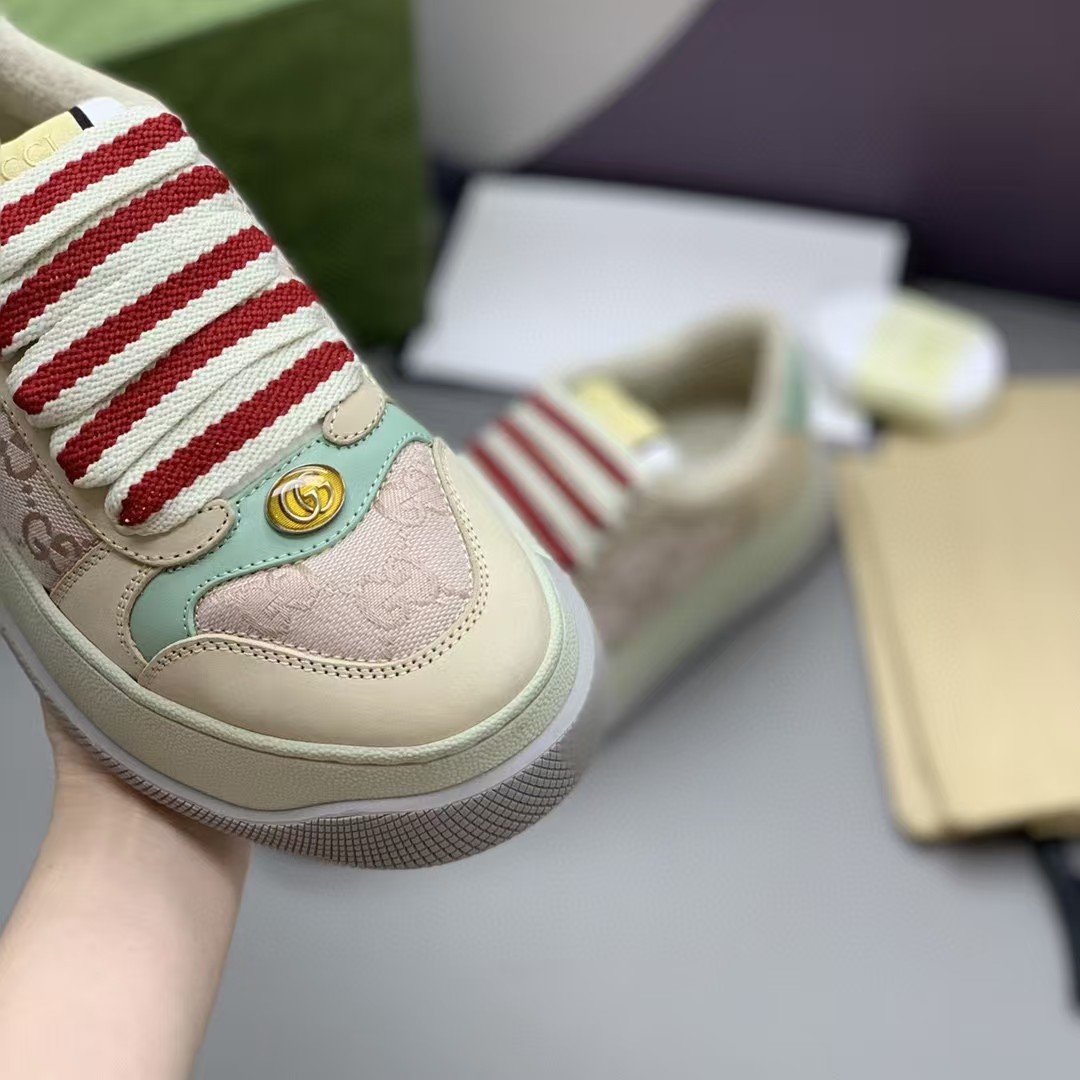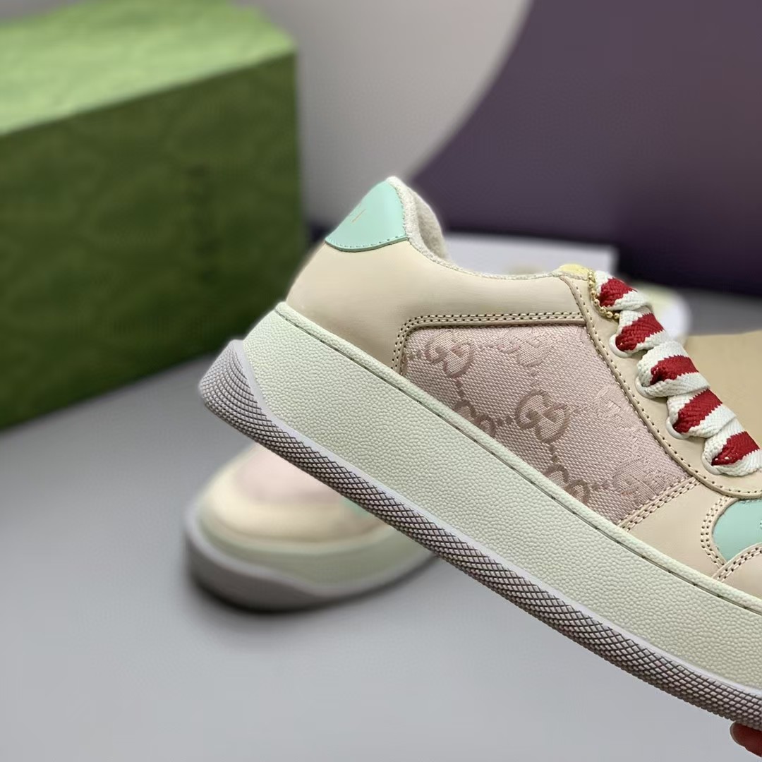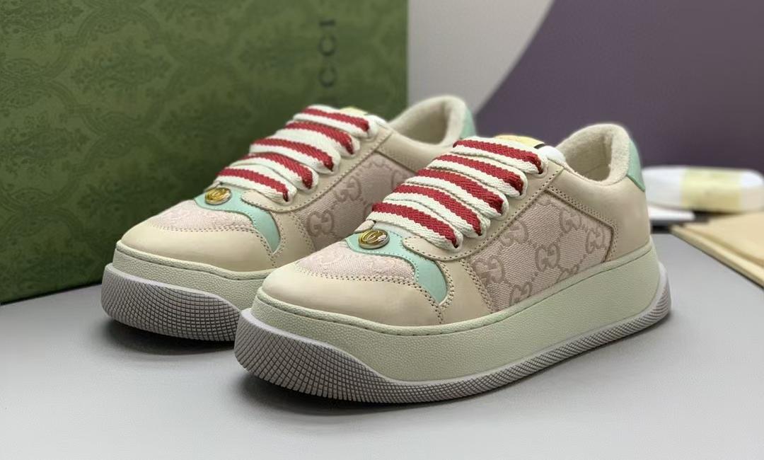 【介绍】女款厚底小脏鞋-此款休闲运动鞋饰以采用吸汗毛巾布里细腻柔软更舒适透气,金属双 G 椭圆形珐琅细节,标签上装饰 G~ 复古标识