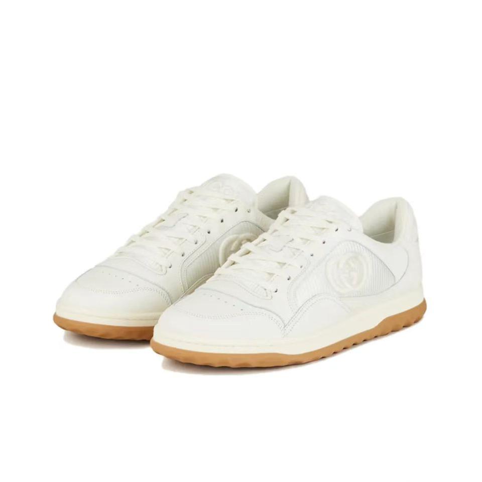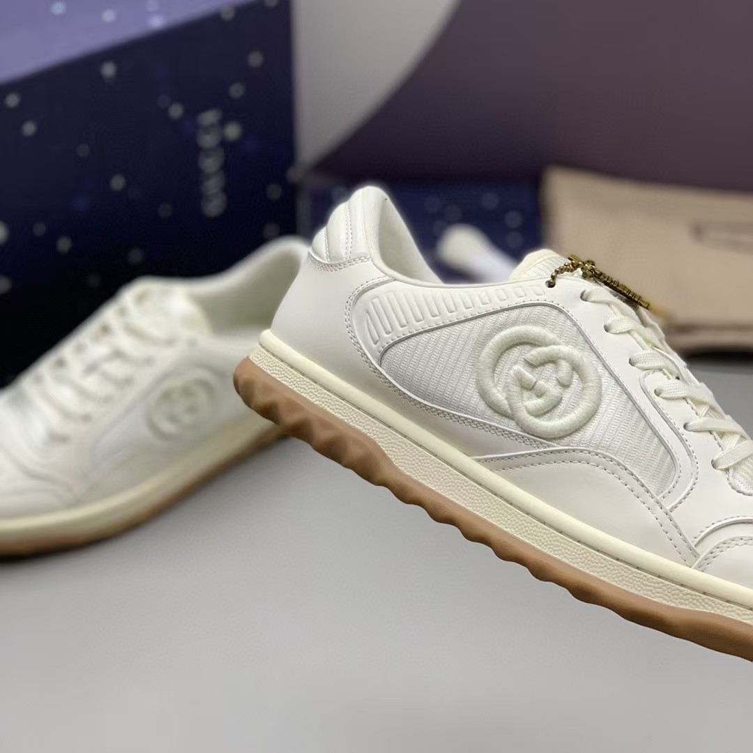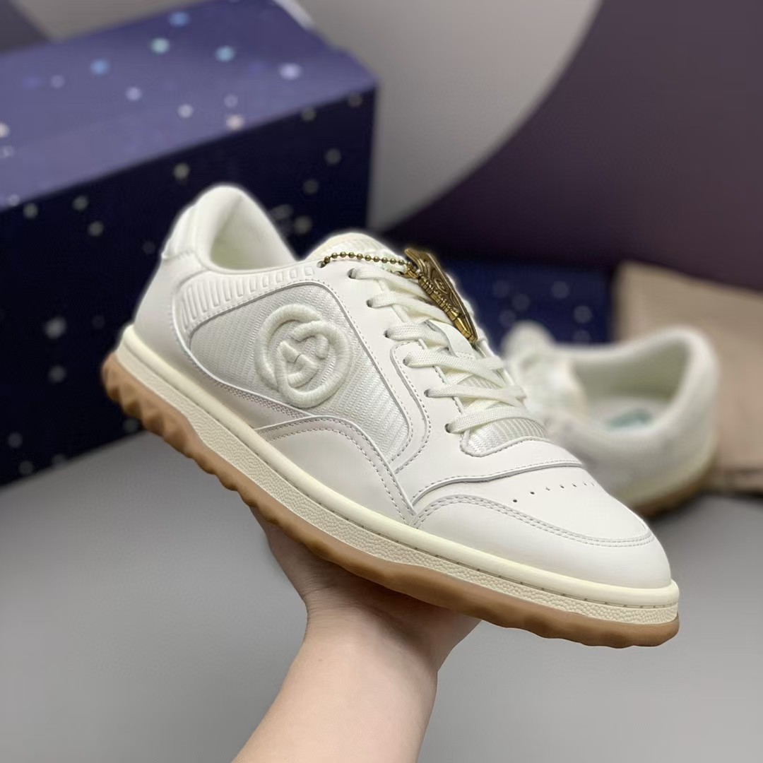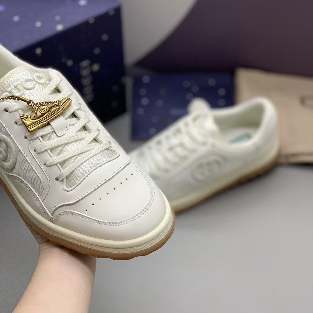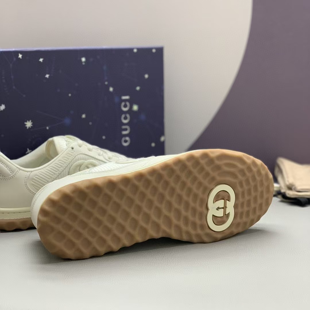 【介绍】情侣款男女同款运动休闲鞋 。鞋面选用米白色牛皮。搭配米白色织物镶饰,复古灵感巧妙融于运动鞋设计,精致小巧的互扣式双G刺绣标识浪漫诠释此系列的美学理念。