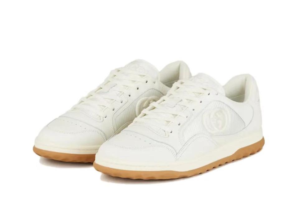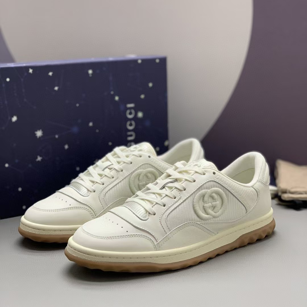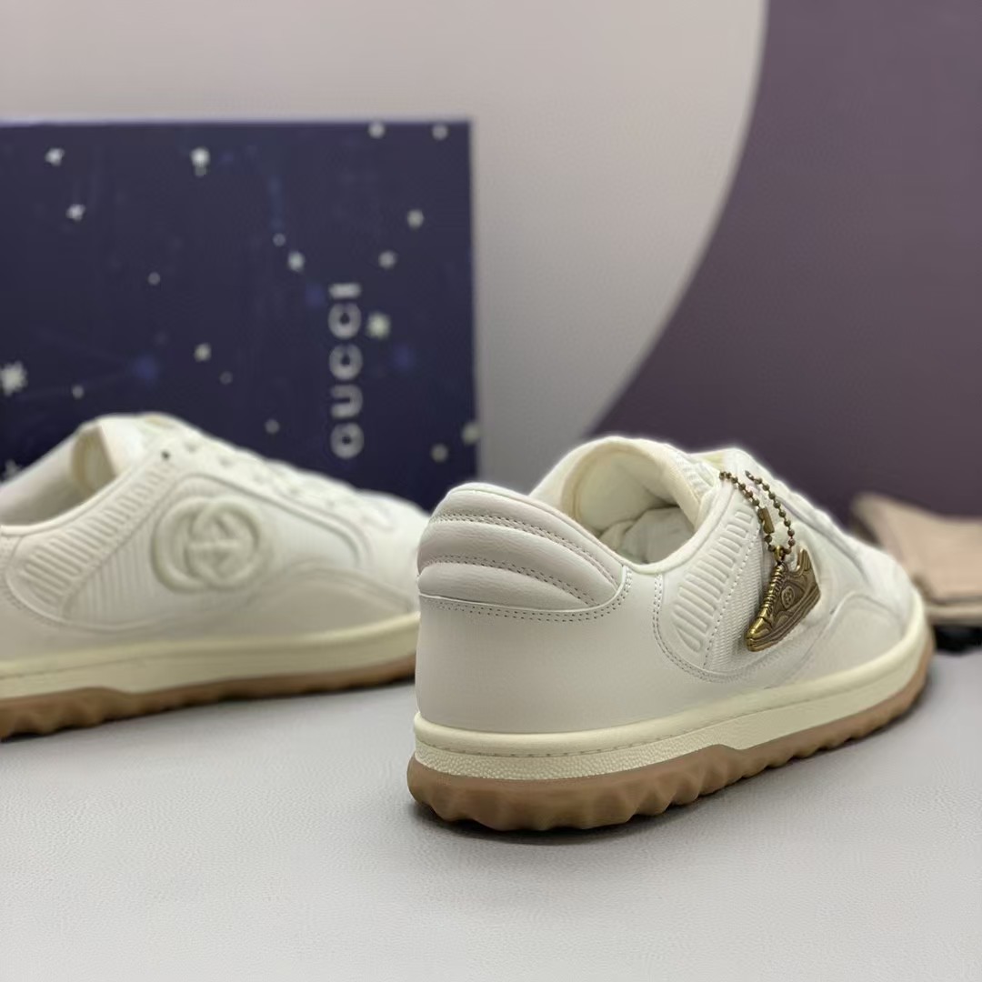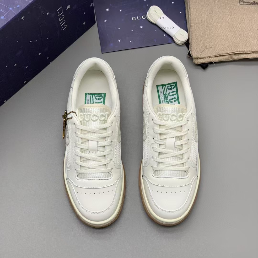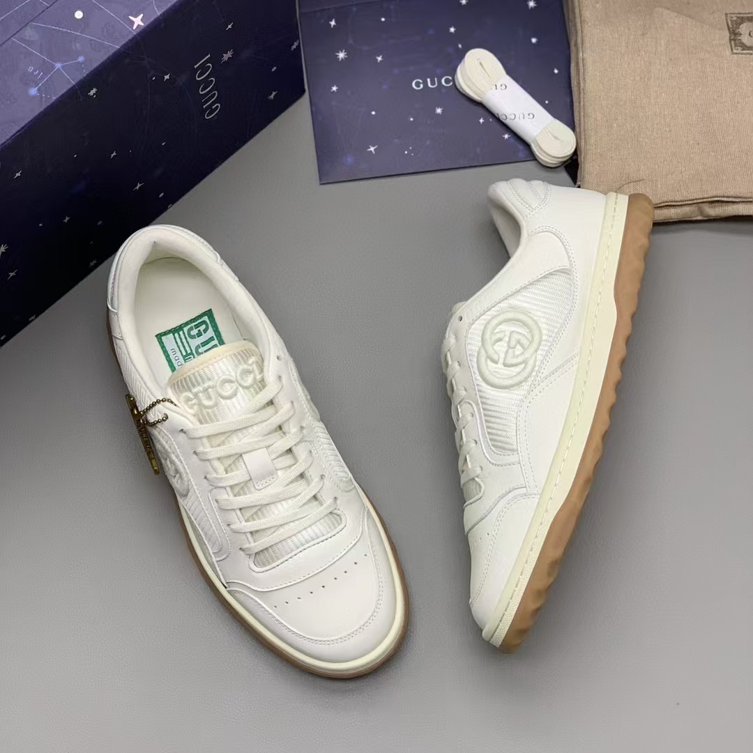 【介绍】情侣款男女同款运动休闲鞋 。鞋面选用米白色牛皮。搭配米白色织物镶饰,复古灵感巧妙融于运动鞋设计,精致小巧的互扣式双G刺绣标识浪漫诠释此系列的美学理念。