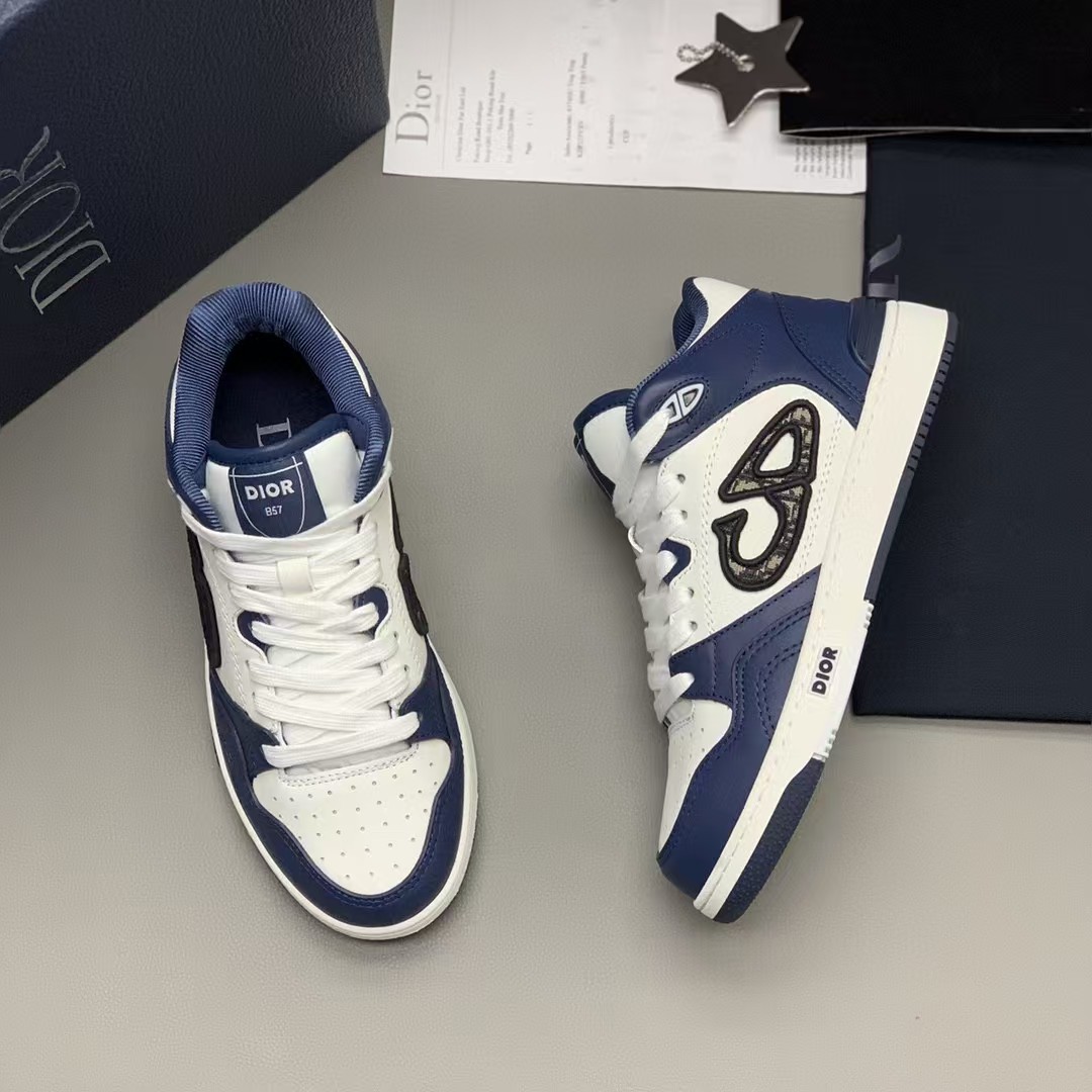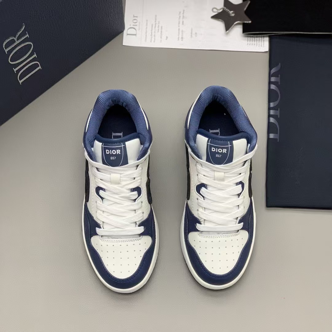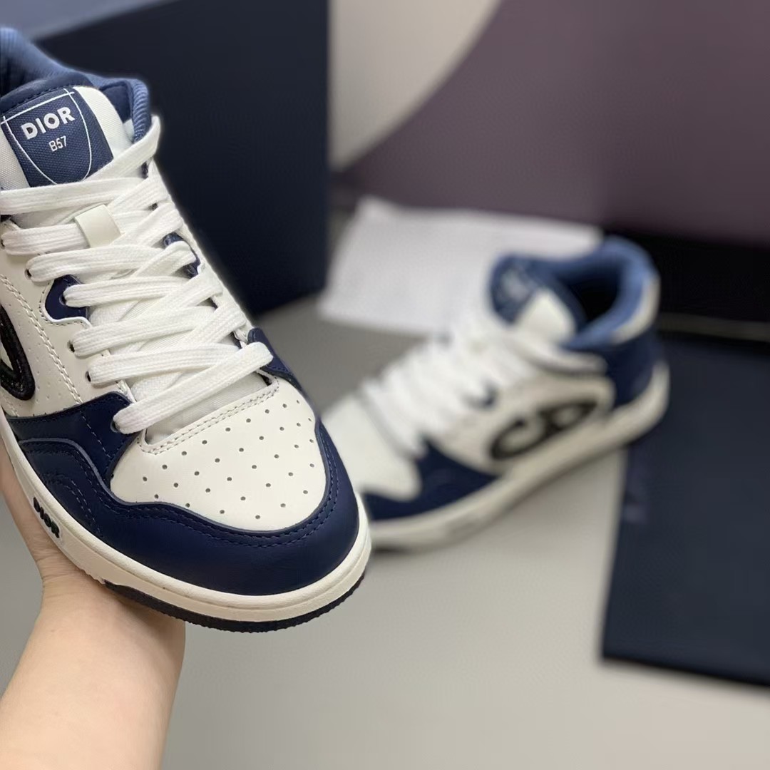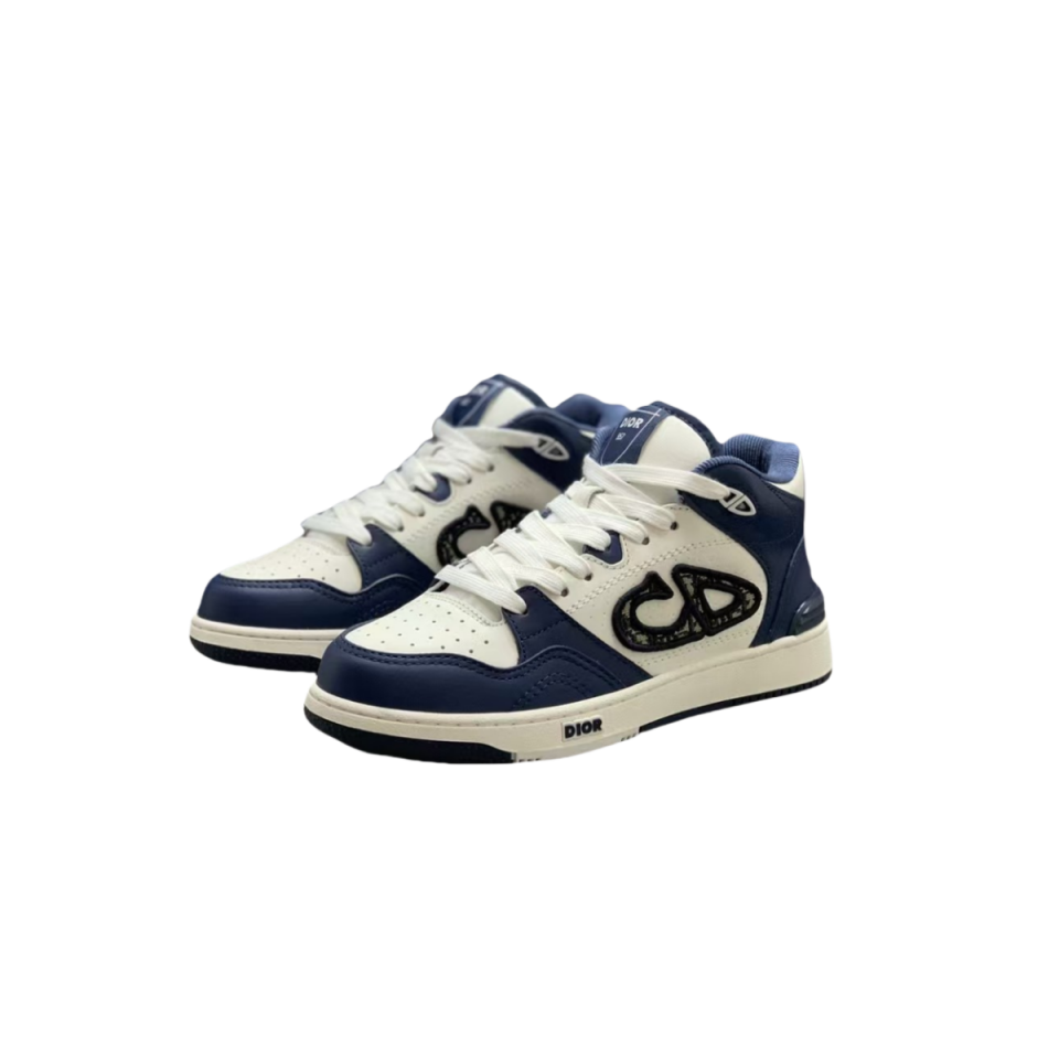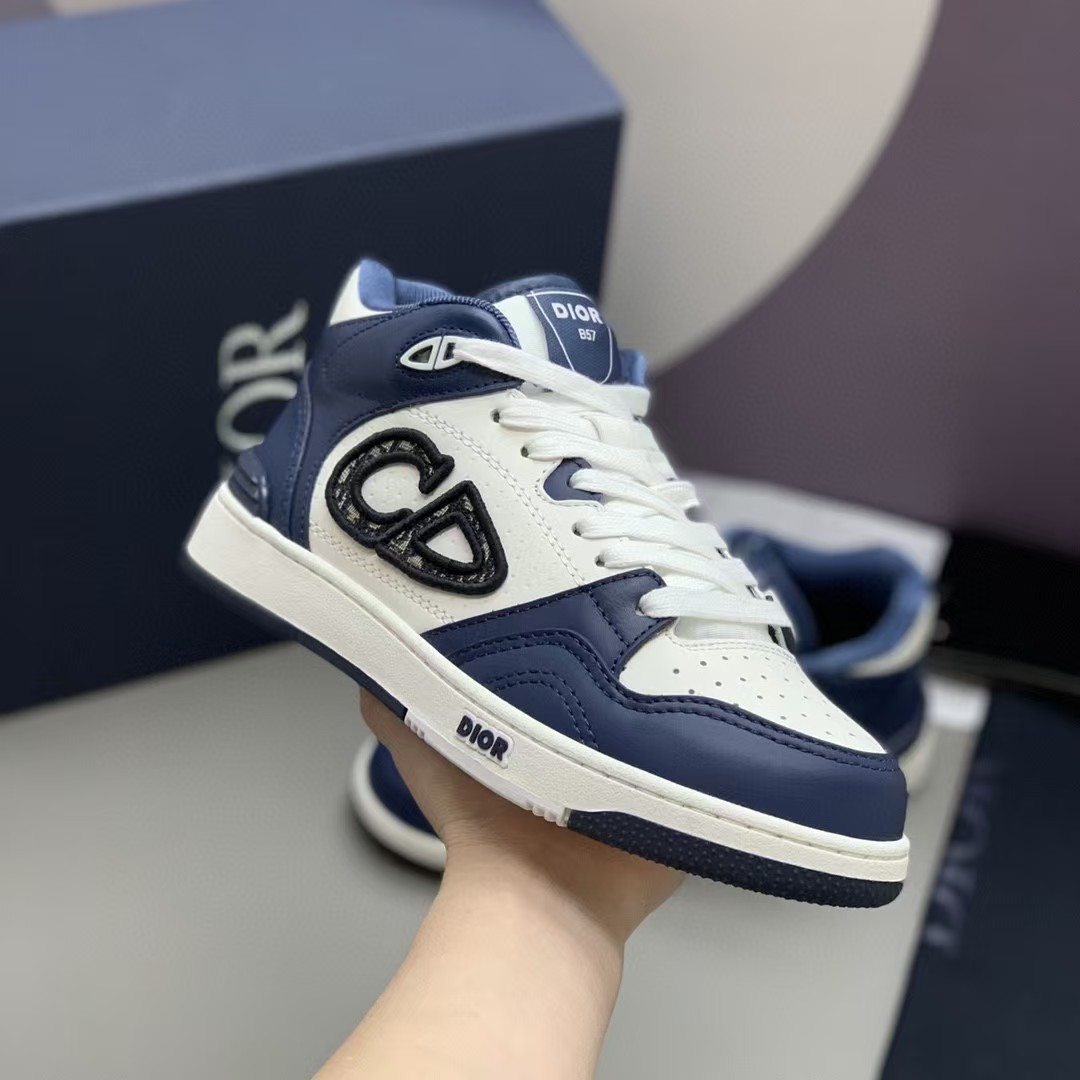【介绍】男女款中帮运动休闲鞋,这款B57中帮鞋重新诠释篮球鞋设计,采用蓝色和奶油白色光滑牛皮革精心制作,搭配米色绒面革,侧面展示皮质 C D 标志。鞋舌、鞋底和后侧饰以各种特色细节提升格调,而孔眼细节、缉面线和橡胶镶片更是突显其运动风格的动感魅力。带有双色橡胶鞋底,可搭配各式服饰,打造精致造型。(时尚百搭,可为各式造型增光添彩)