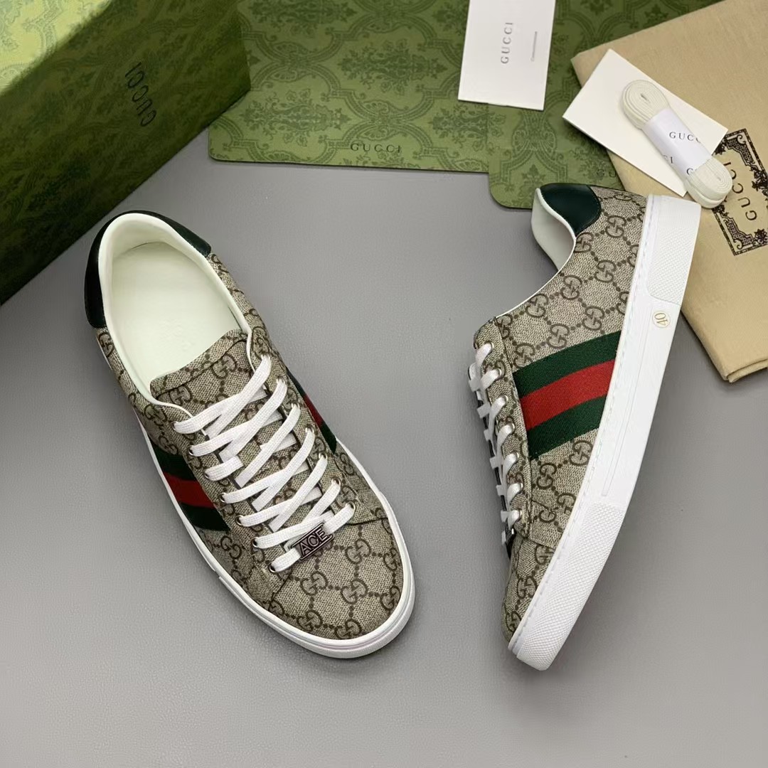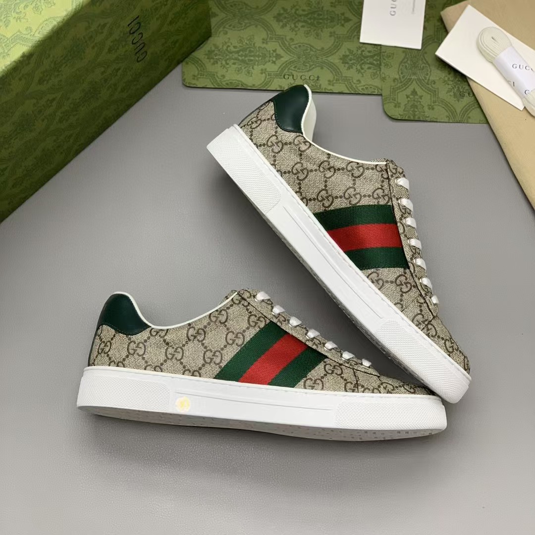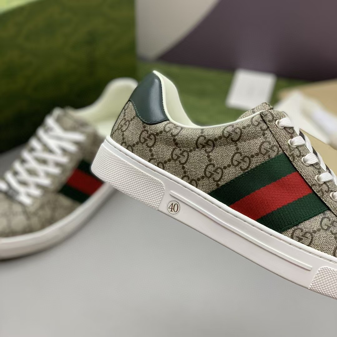 【介绍】男士休闲运动鞋.鞋面采用米色和乌木色G帆布,内里采用柔软舒适吸汗小牛皮,经典红绿条纹织带更添魅力,Ace全新系列呈现特色低帮设计,橡胶鞋底,搭配别致细节,构造精致塑就挺括鞋型,上脚舒适百搭。