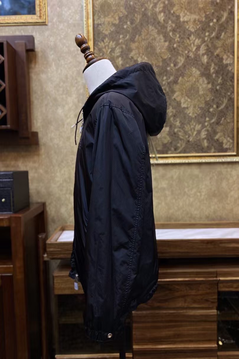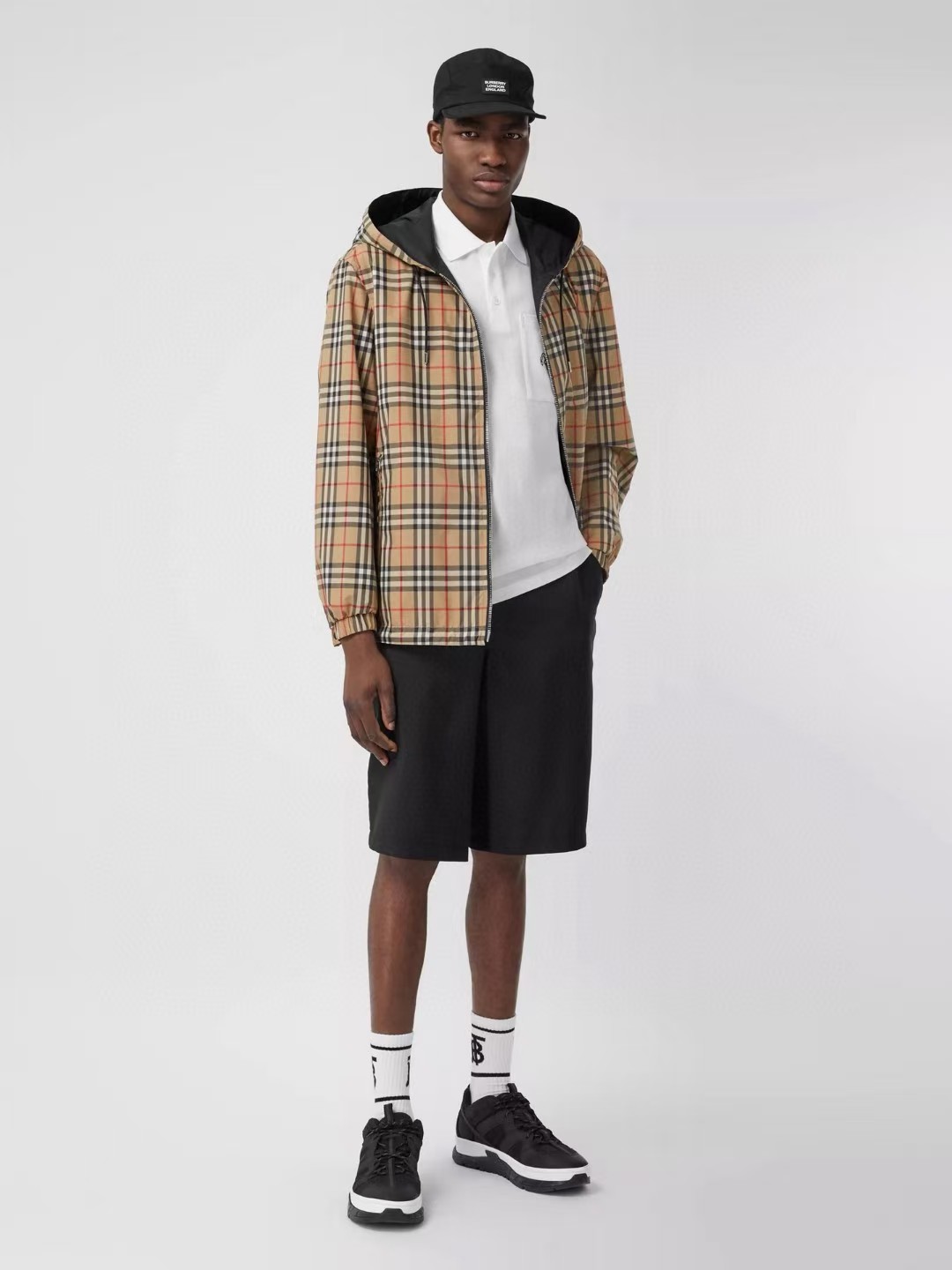 【巴宝莉】双面穿黑色格子拉链夹克,男女同款经典vintage格纹再生聚酯纤维连帽夹克外套!这款夹克格纹外层采用100%聚酯纤维材质,黑色反面则采用尼龙材质精制而成,面料质地轻薄柔软,黑色尼龙面料防水防风,透气性与舒适度都无法挑剔!衣身正面满幅经典vintage格纹图案装饰,奢华感与辨识度极高,其品牌魅力值更是毋庸置疑,无处不彰显着英伦风范!反面亮泽且光滑的黑色尼龙面料,具有优越的户外防风防水性能,可在各种环境下穿着,此款时尚感与实用性兼备。