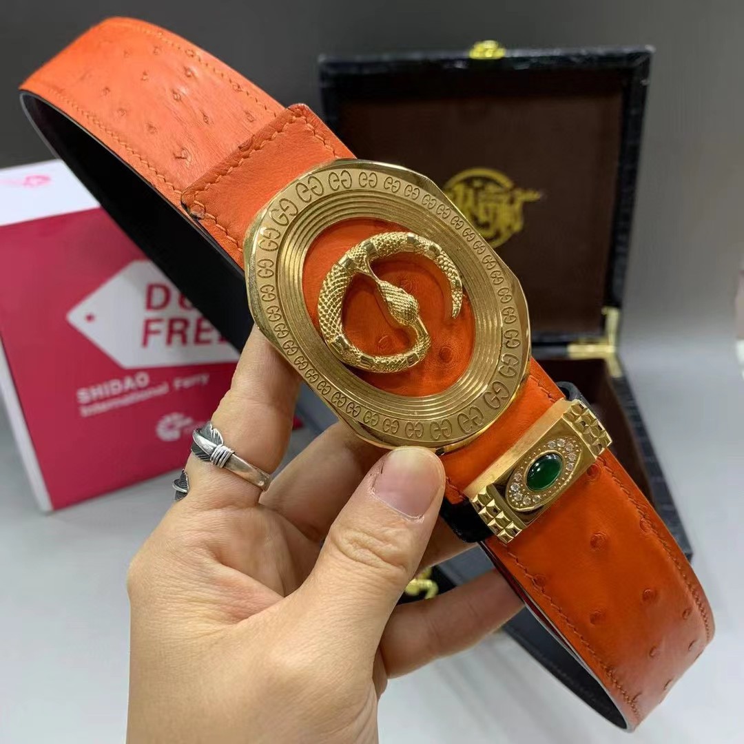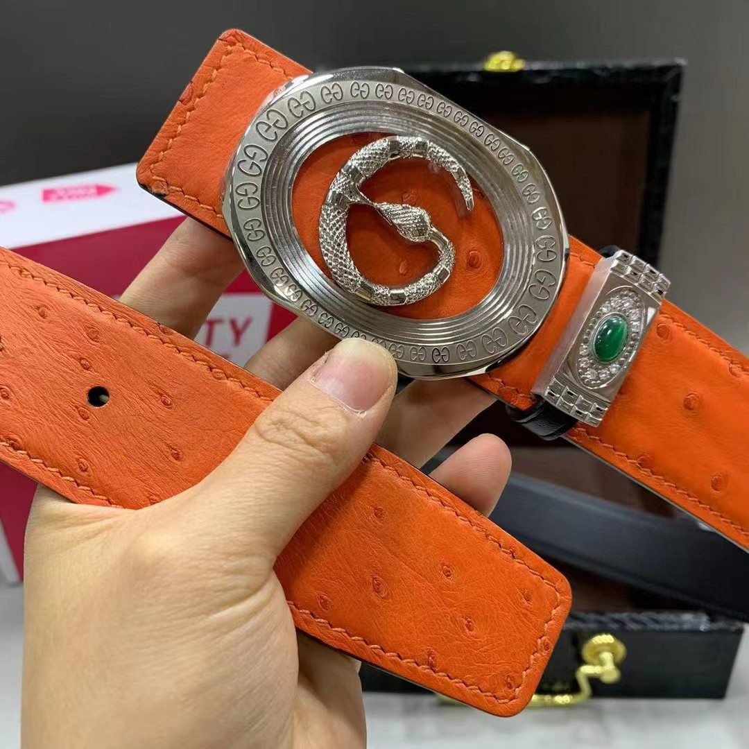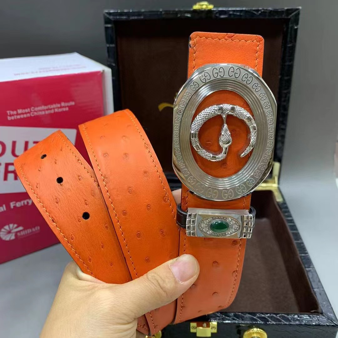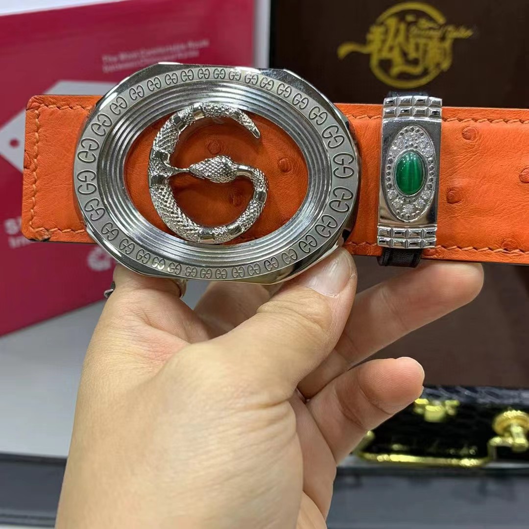 【描述】采用进口澳洲野生炫彩橙鸵鸟皮(无拼接)大颗粒毛孔钉,搭配奢华精钢蛇G扣头,凸显高端男士奢华的品味!