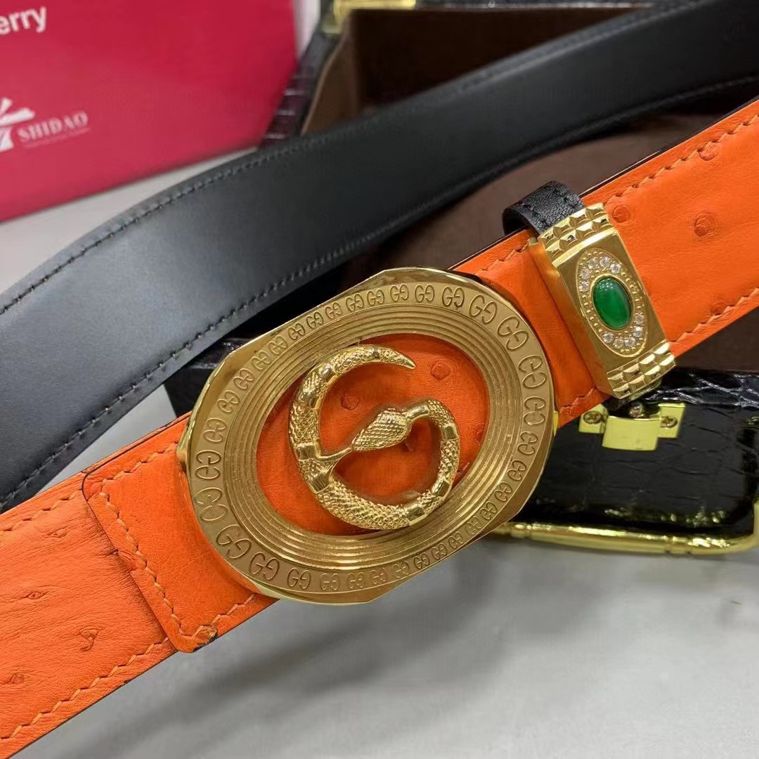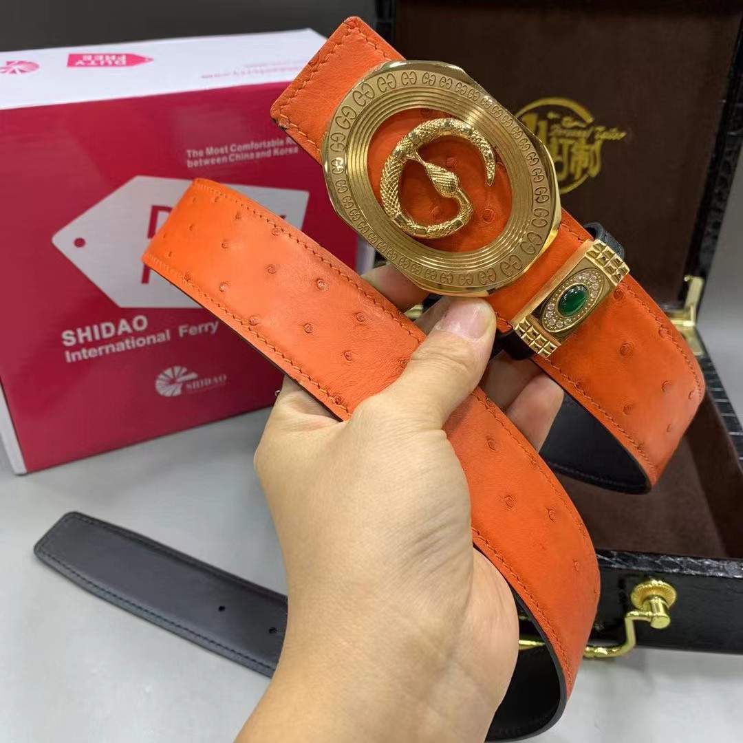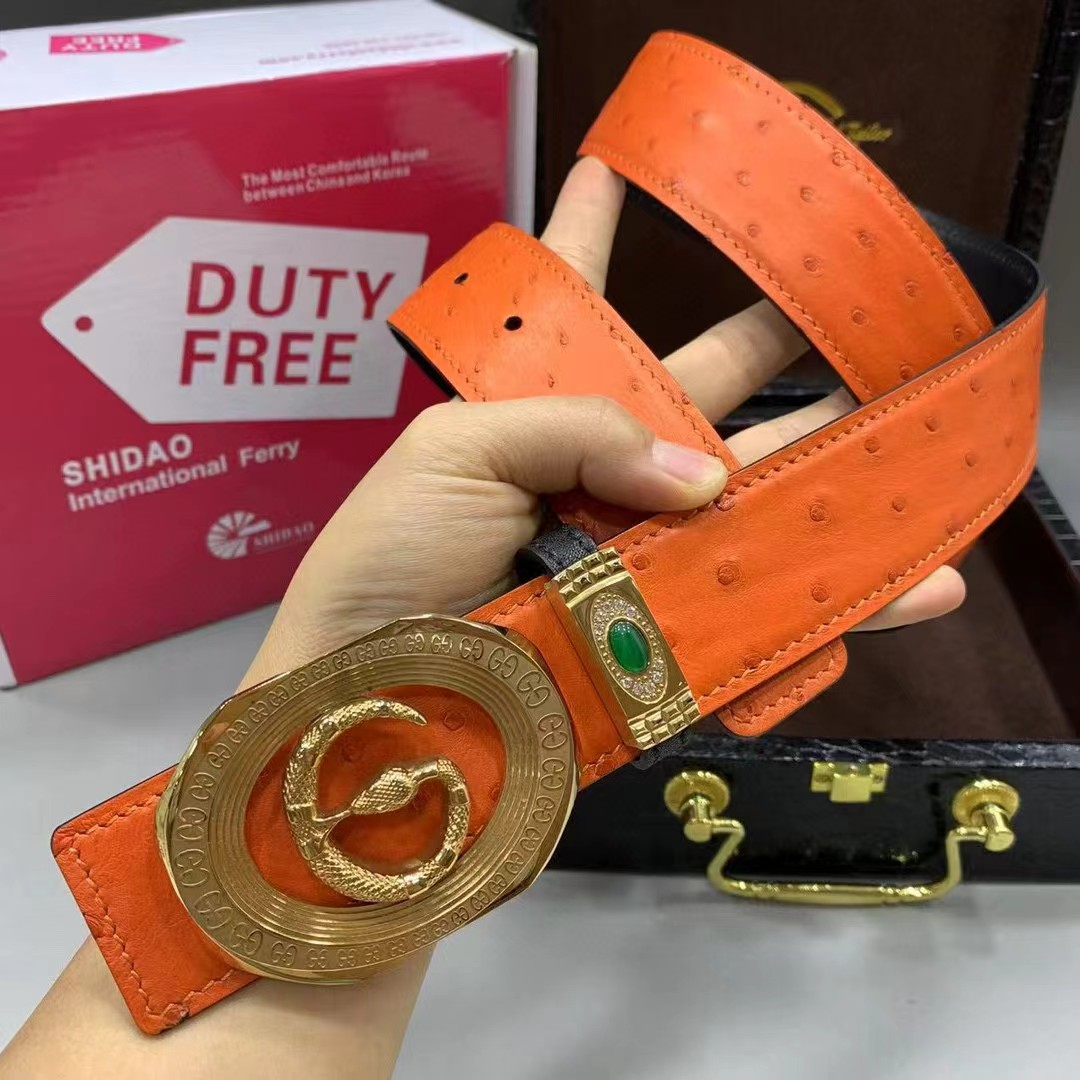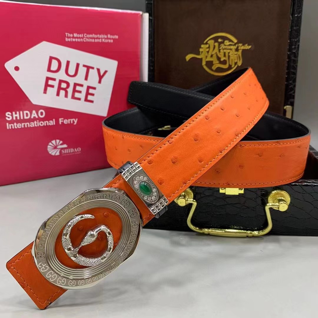 【描述】采用进口澳洲野生炫彩橙鸵鸟皮(无拼接)大颗粒毛孔钉,搭配奢华精钢蛇G扣头,凸显高端男士奢华的品味!