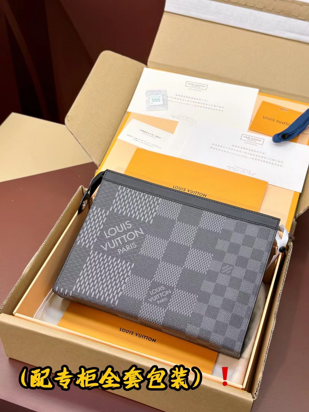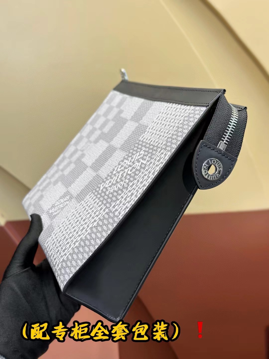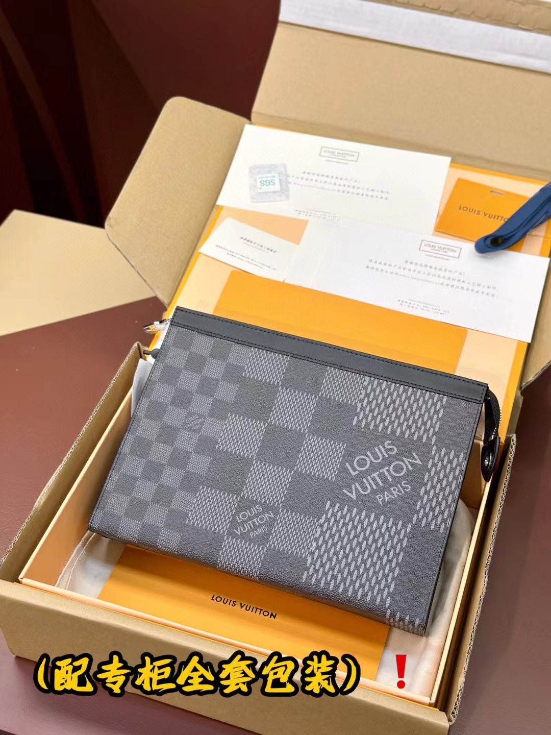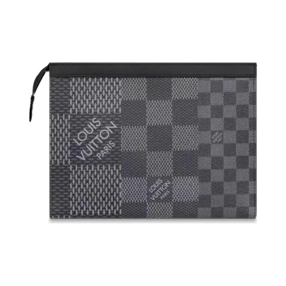 【介绍】 POCHETTE VOYAGE 手拿包!本款 Pochette Voyage 手拿包选取 Damier Graphite 3D 帆布,展现路易威登经典格纹的当代演绎。大号隔层和卡位方便收纳旅行文件及日常所需,可与旅行箱搭配使用,让出行有条不紊。