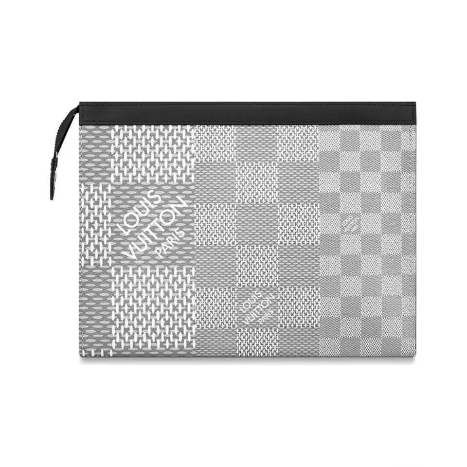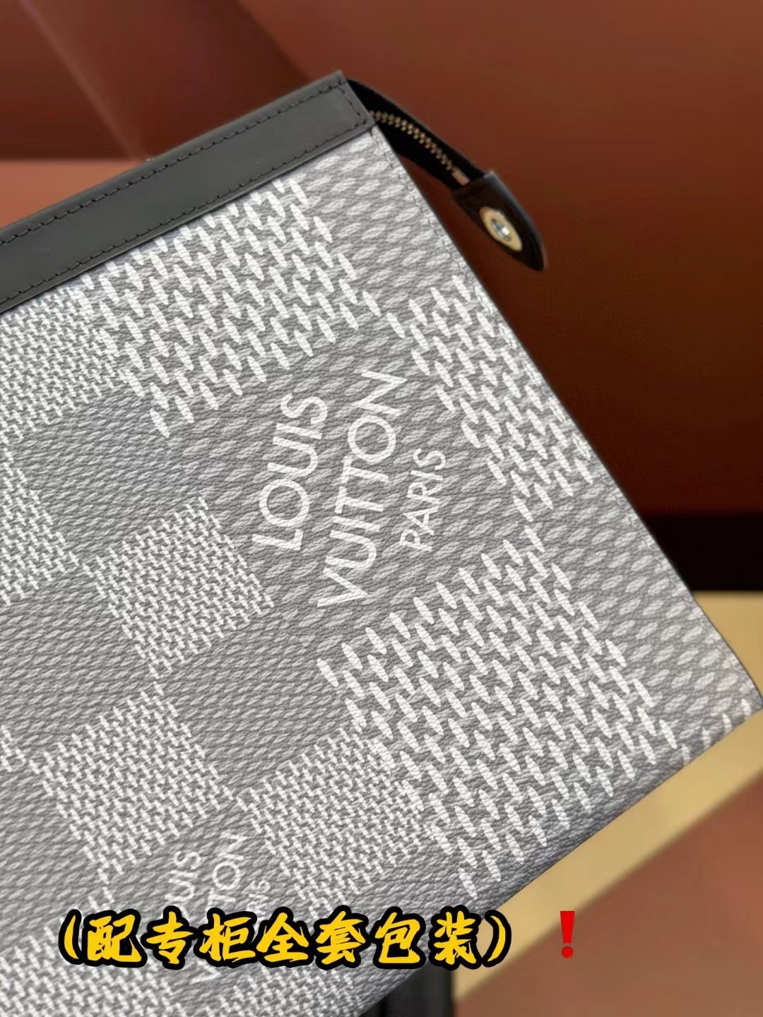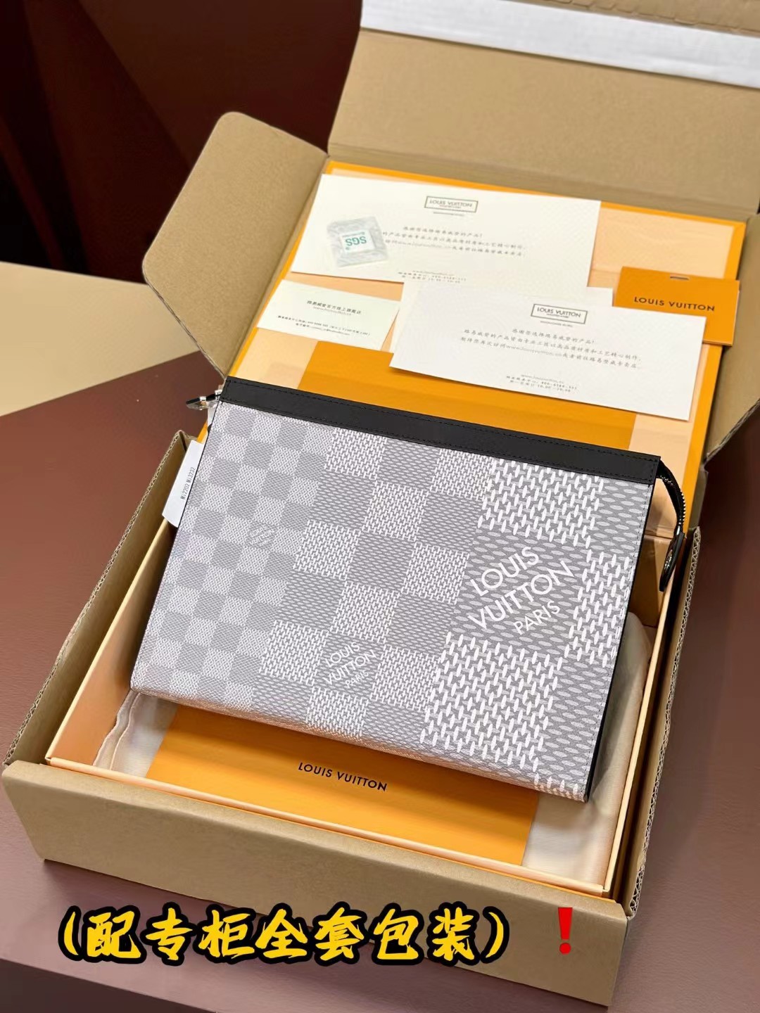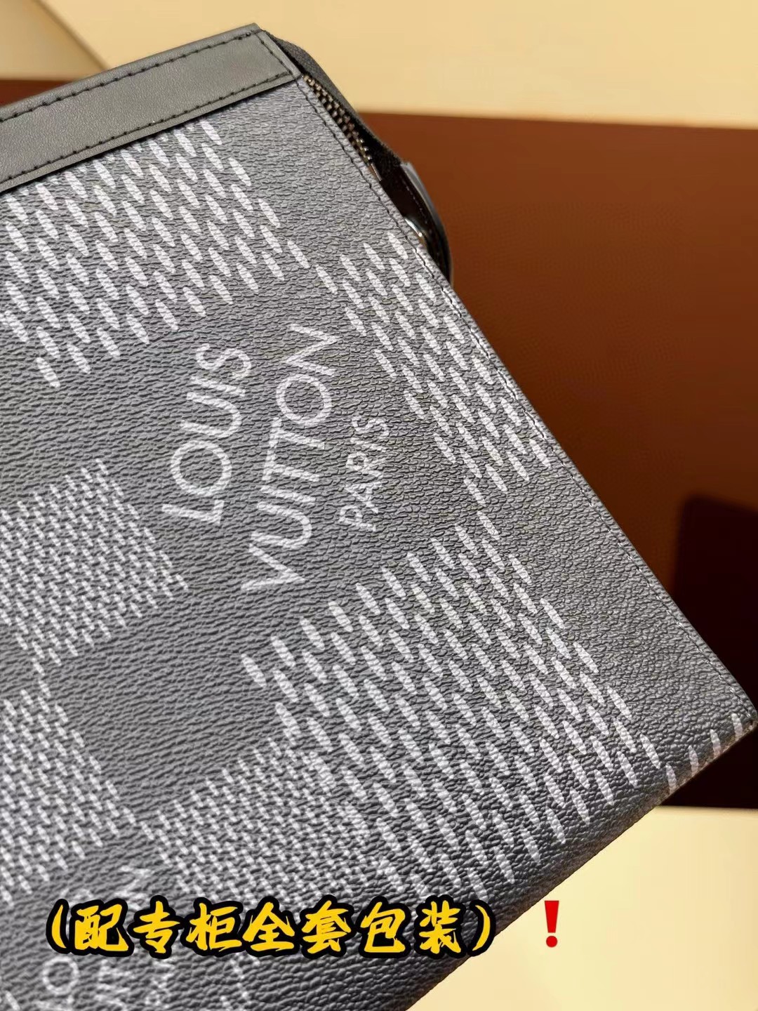 【介绍】 POCHETTE VOYAGE 手拿包!本款 Pochette Voyage 手拿包选取 Damier Graphite 3D 帆布,展现路易威登经典格纹的当代演绎。大号隔层和卡位方便收纳旅行文件及日常所需,可与旅行箱搭配使用,让出行有条不紊。