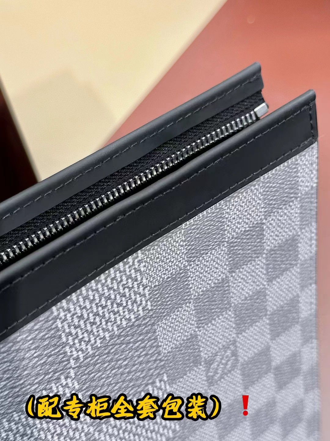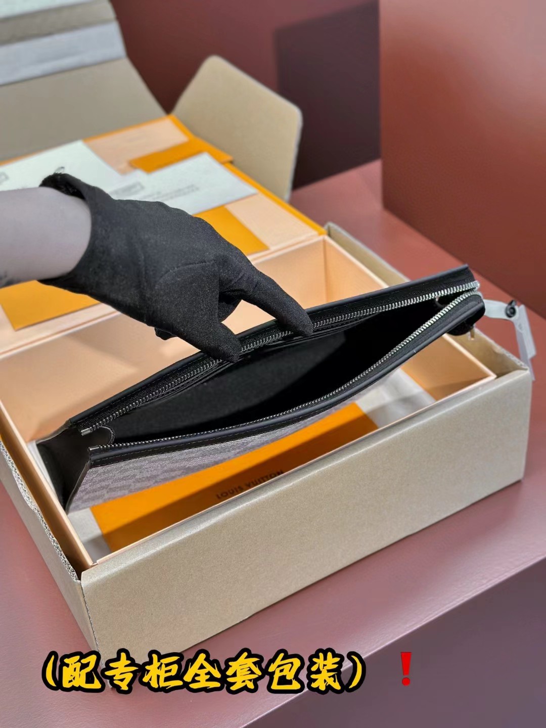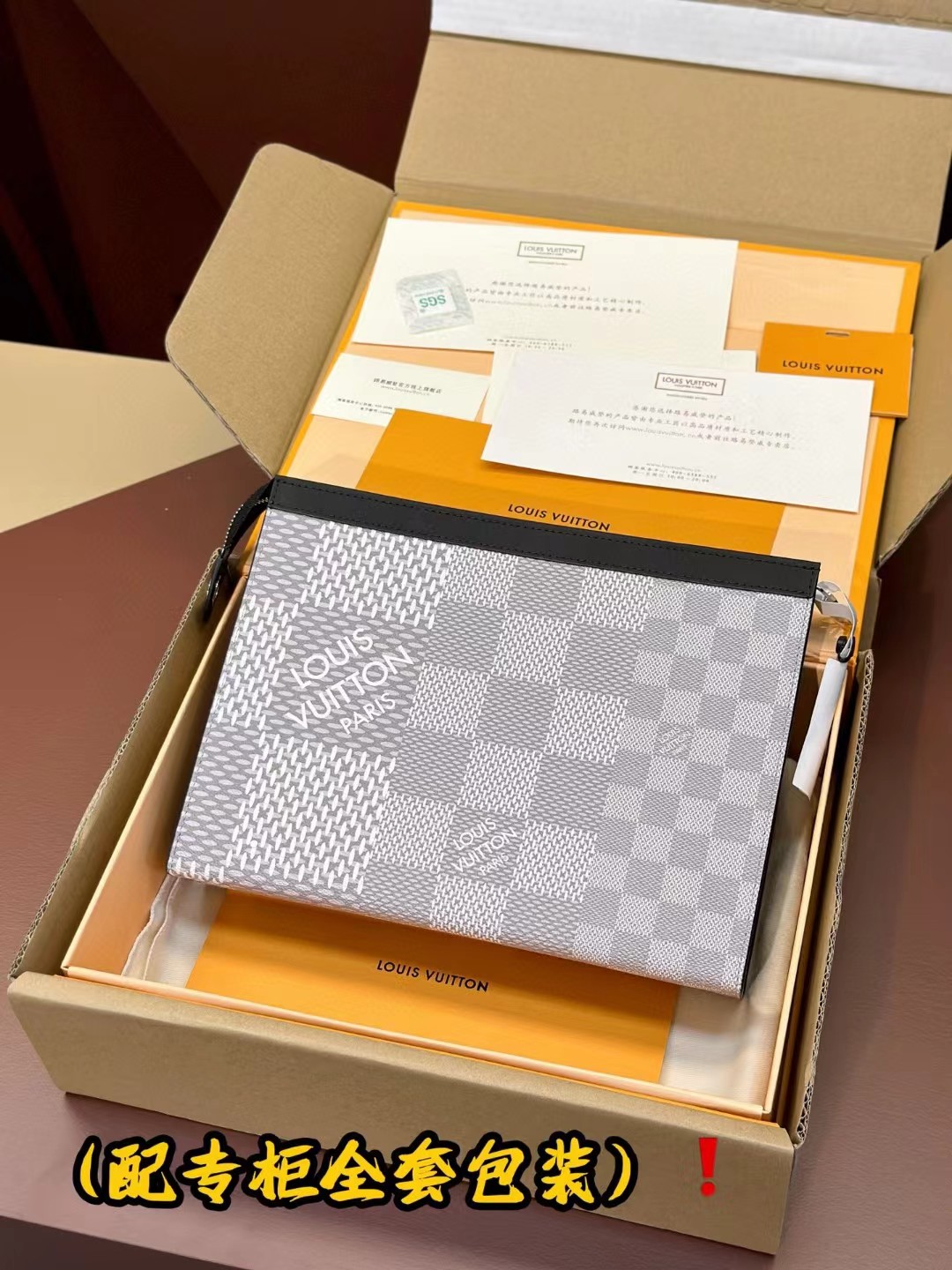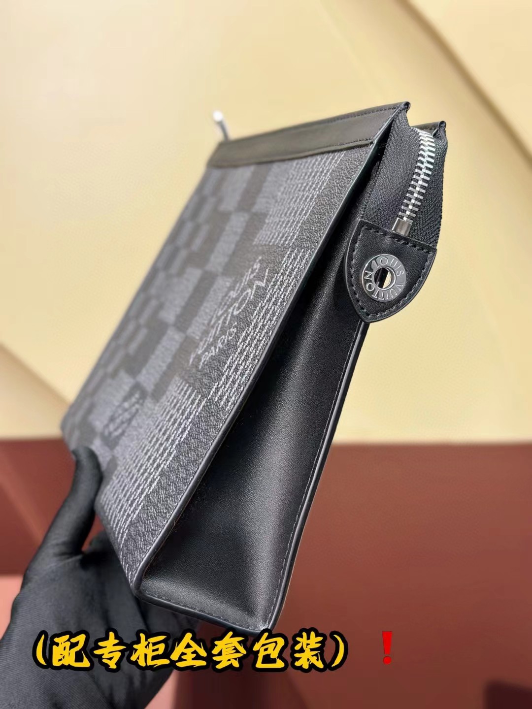 【介绍】 POCHETTE VOYAGE 手拿包!本款 Pochette Voyage 手拿包选取 Damier Graphite 3D 帆布,展现路易威登经典格纹的当代演绎。大号隔层和卡位方便收纳旅行文件及日常所需,可与旅行箱搭配使用,让出行有条不紊。