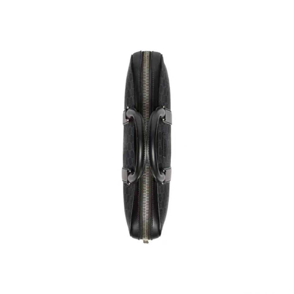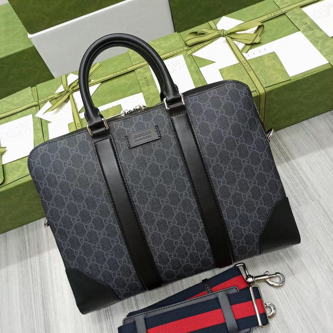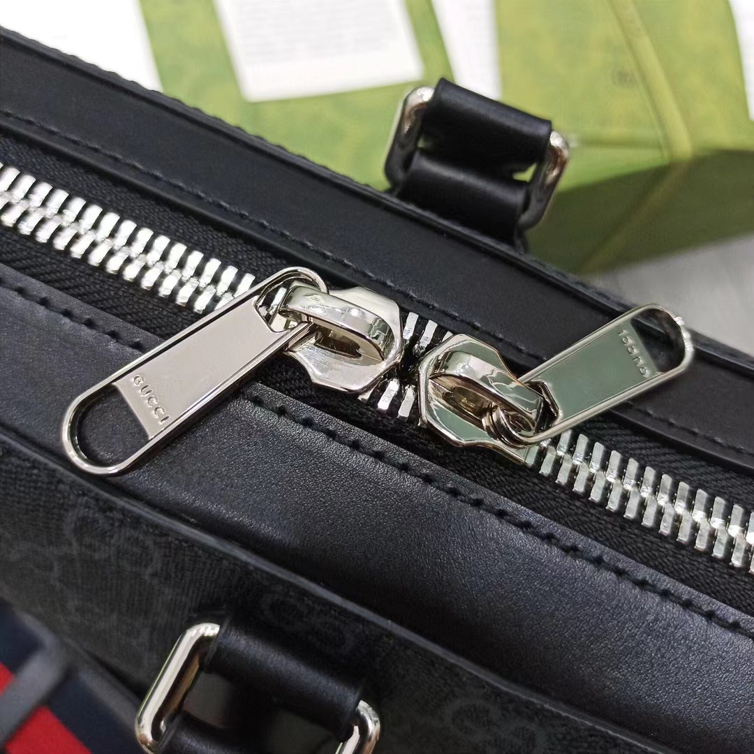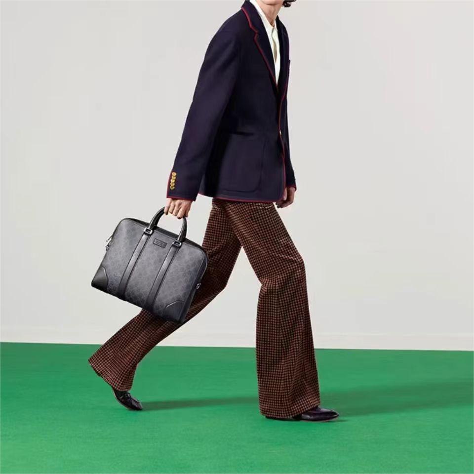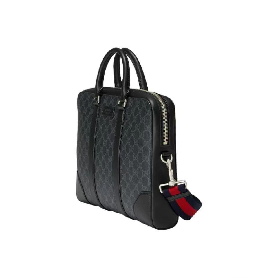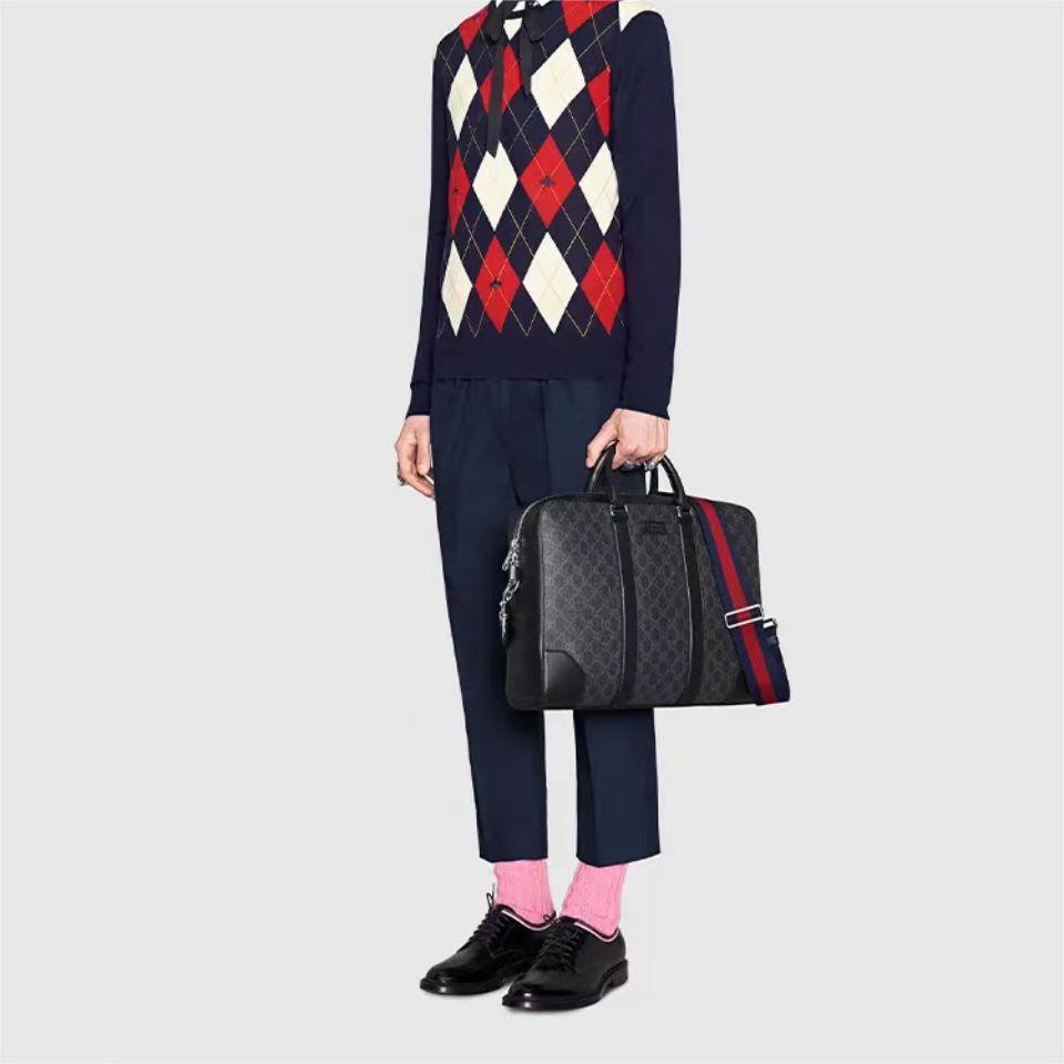 Gucci 古驰 老花LOGO条纹织带 帆布拼皮革 单肩斜挎手提公文包