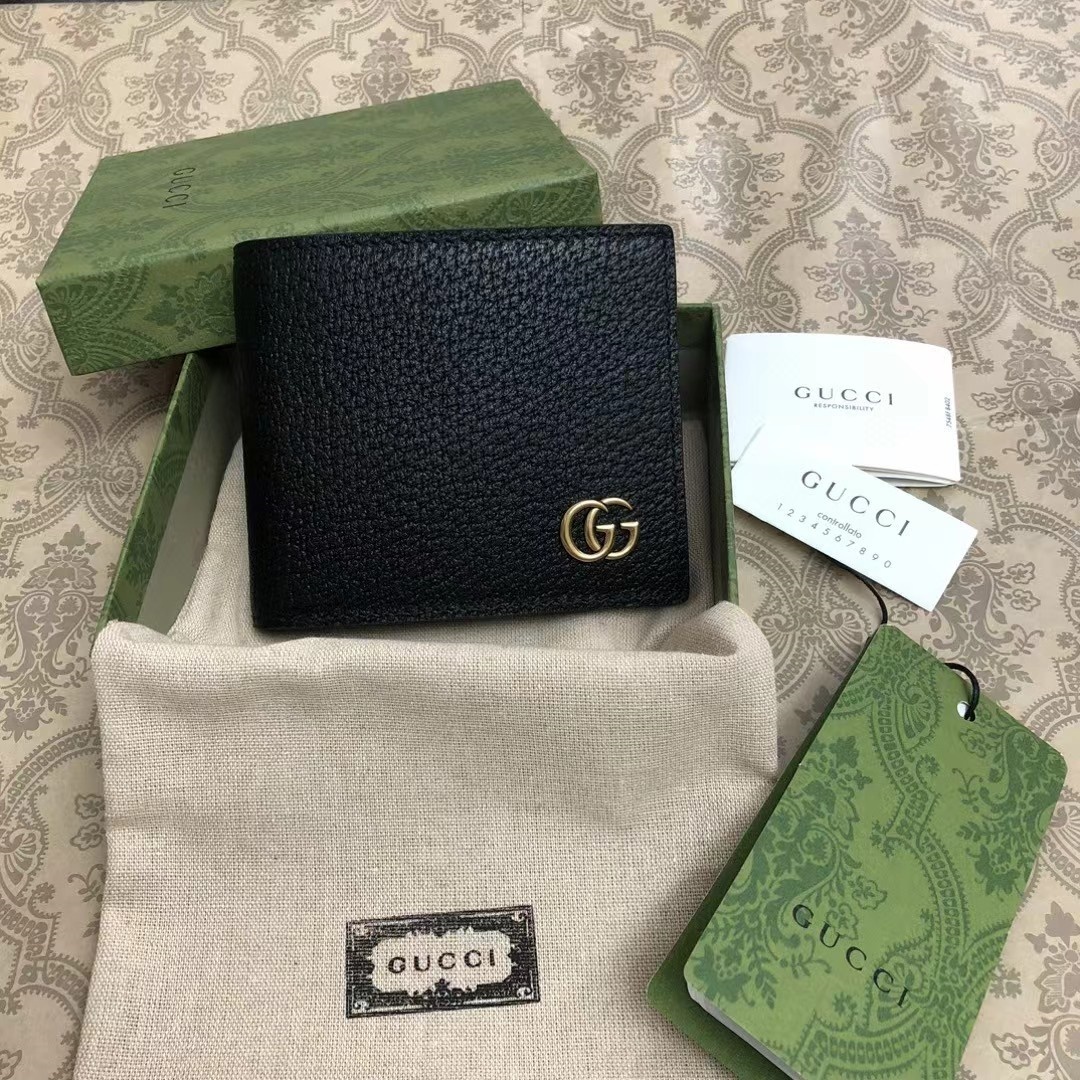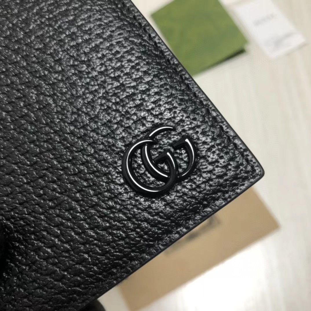 【介绍】此款短钱包,配以醒目的标志性双 G 金属配件。采用热压小牛皮制作,以获得野猪猪皮效果,营造织纹外观。