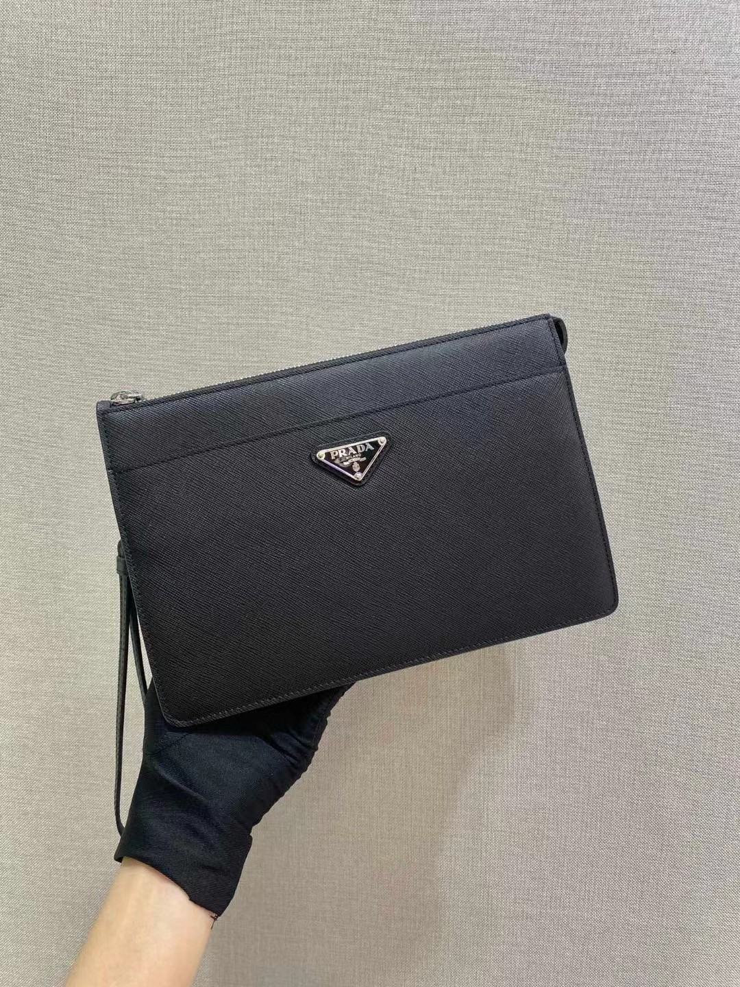 【介绍】 海外原单 这款造型时尚的男士手袋配有一条可拆卸皮革腕带。三角形金属徽标点缀其上,释放独特的品牌气息。采用进口Saffiano皮革材质,顶做金属配件一个拉链隔层,一个内部口袋和六个卡槽,两个磁扣式外部口袋,简单又大气,男士们值得拥有。赶紧入手吧。