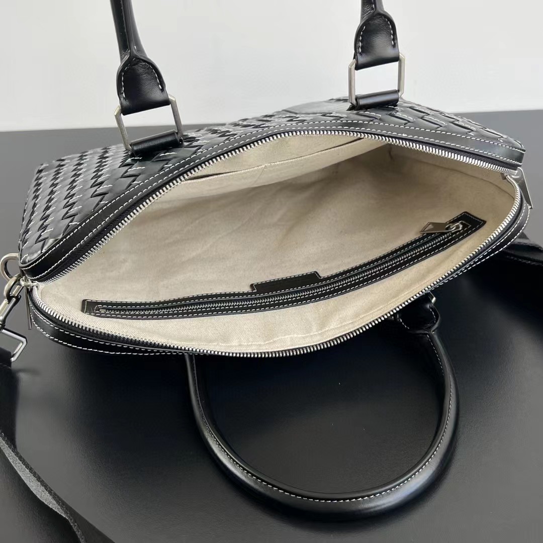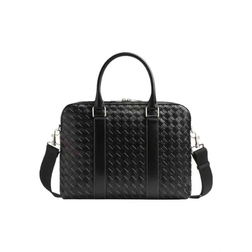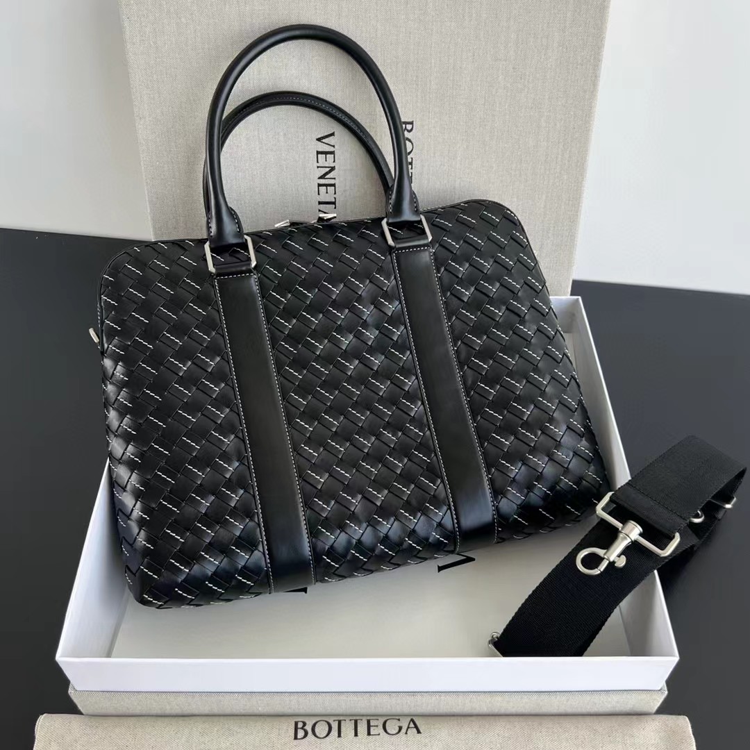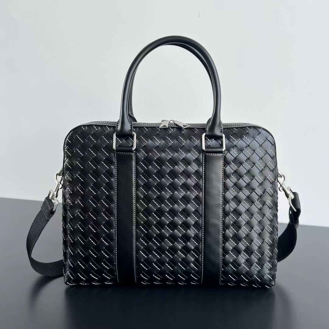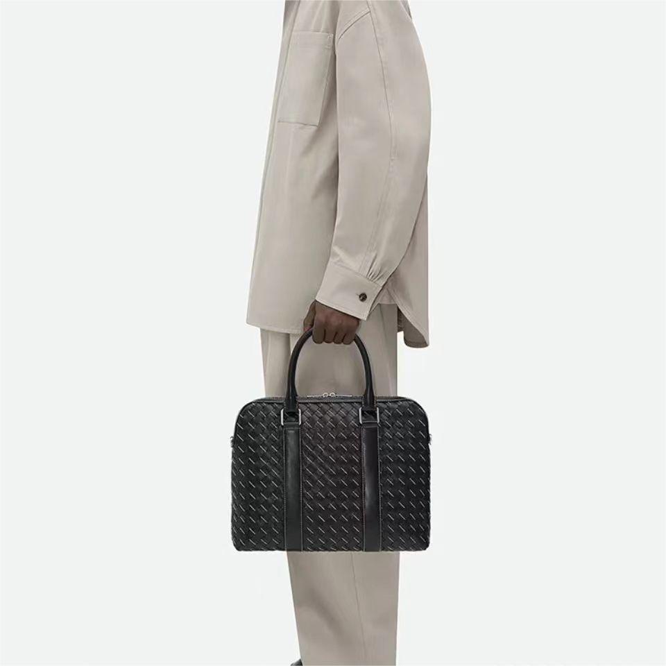 【介绍】 新款男士缝线公文包。编织是BV logo性的标识 极具品牌特色 采用进口牛皮编织 拉链开合 内里大容量 加拉链口袋 实用功能设计 缝线编织搭配 尽显时尚休闲 肩带可随意拆卸 可斜挎可手拎 休闲商务都能兼顾 稳重不失时尚感。