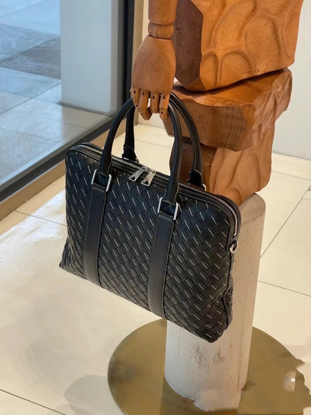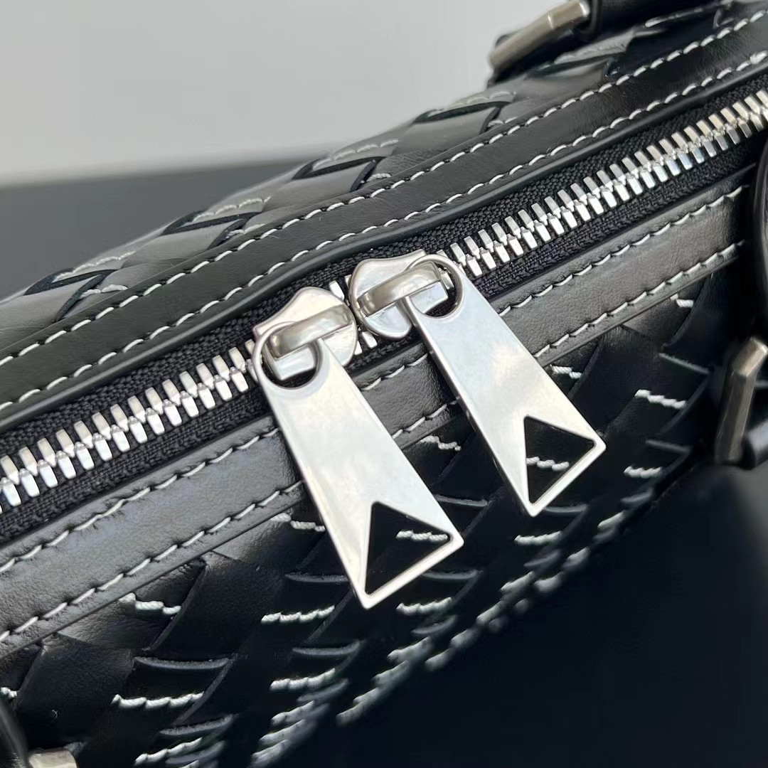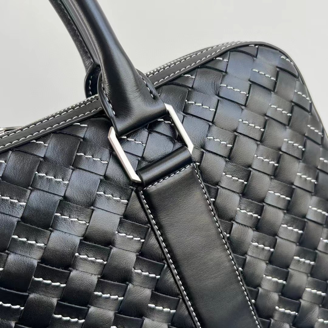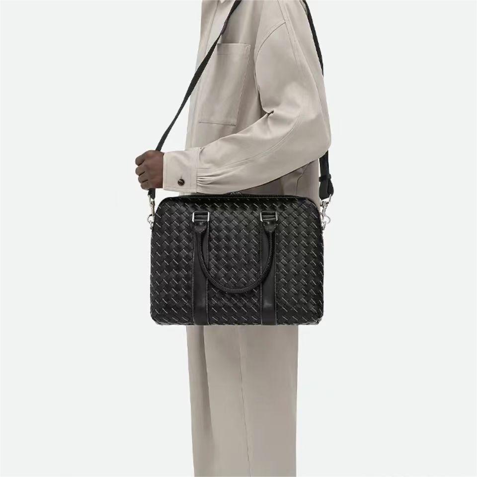 【介绍】 新款男士缝线公文包。编织是BV logo性的标识 极具品牌特色 采用进口牛皮编织 拉链开合 内里大容量 加拉链口袋 实用功能设计 缝线编织搭配 尽显时尚休闲 肩带可随意拆卸 可斜挎可手拎 休闲商务都能兼顾 稳重不失时尚感。