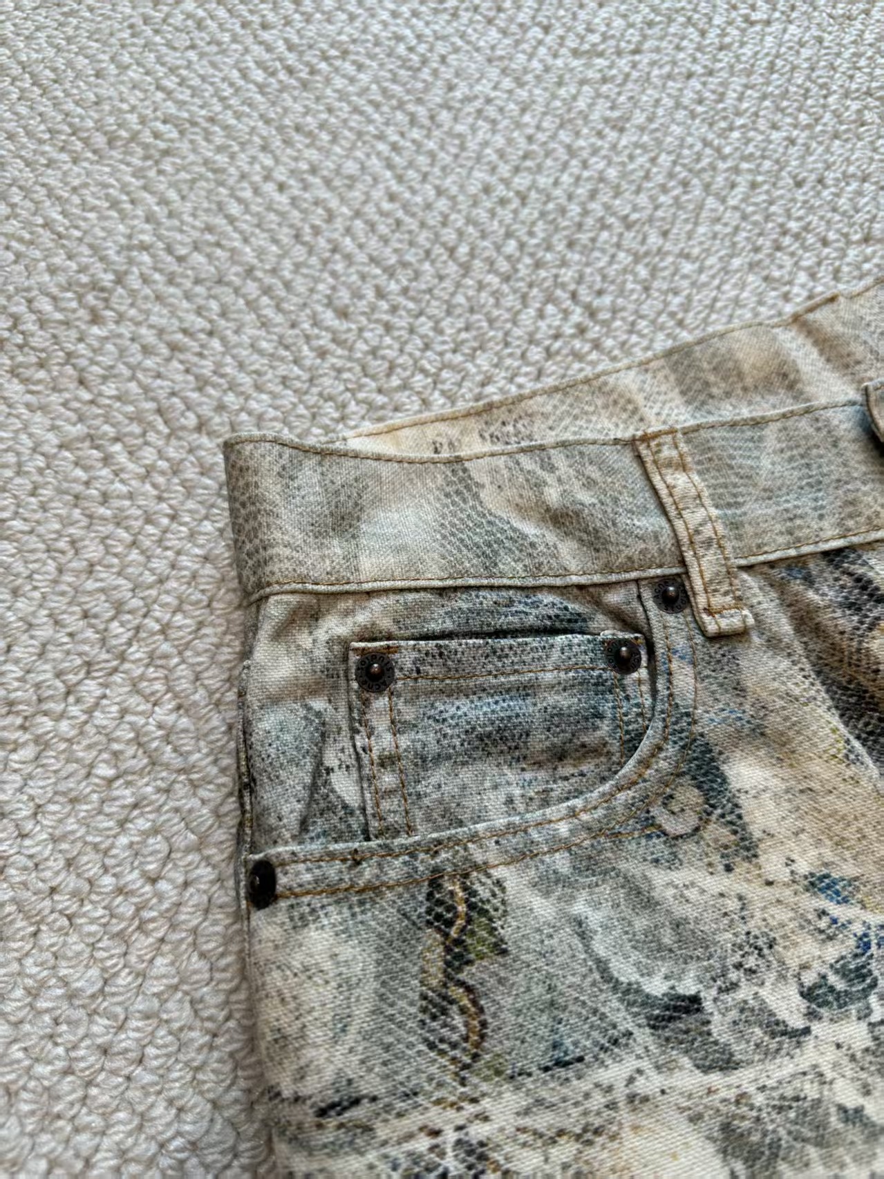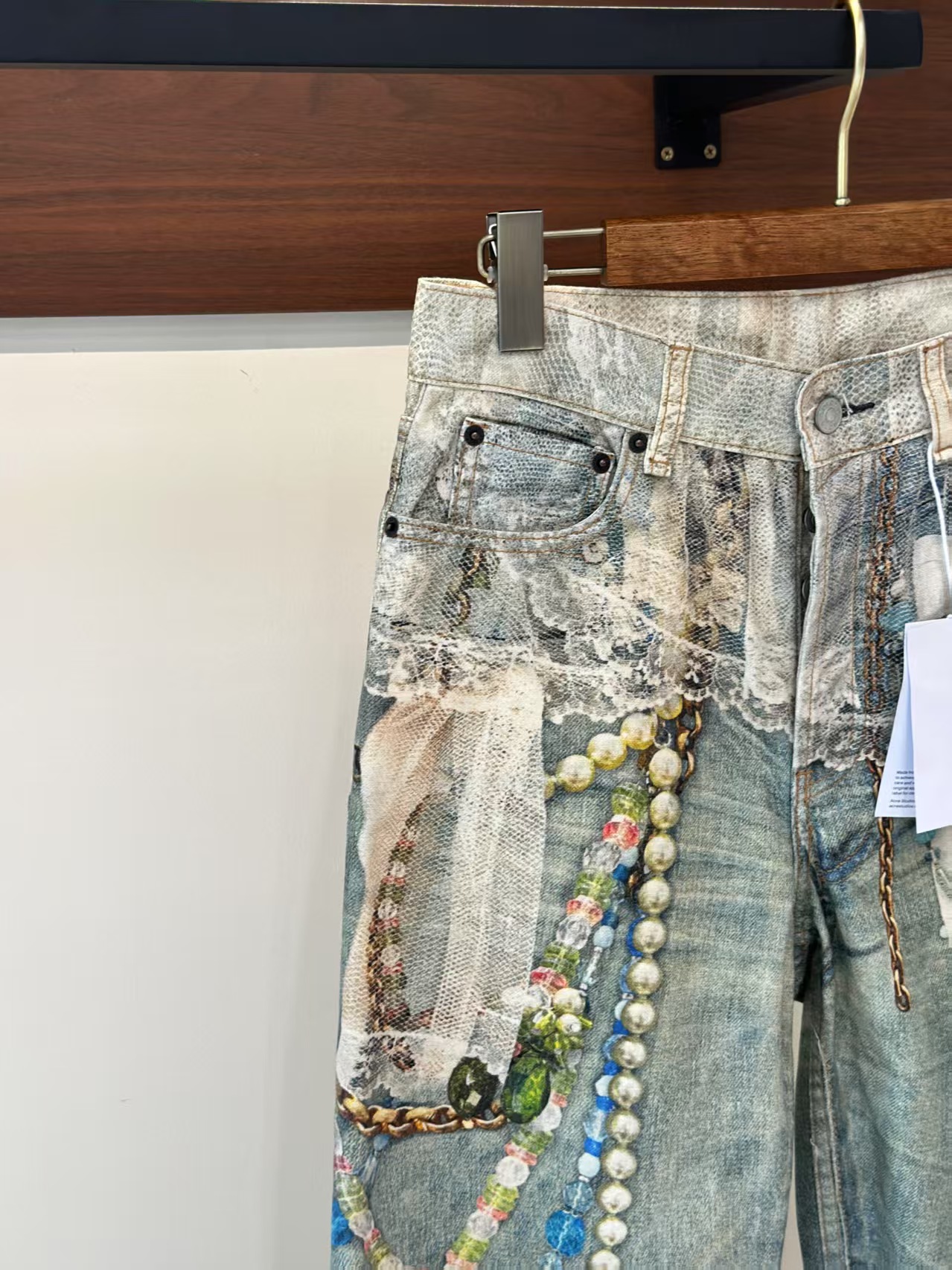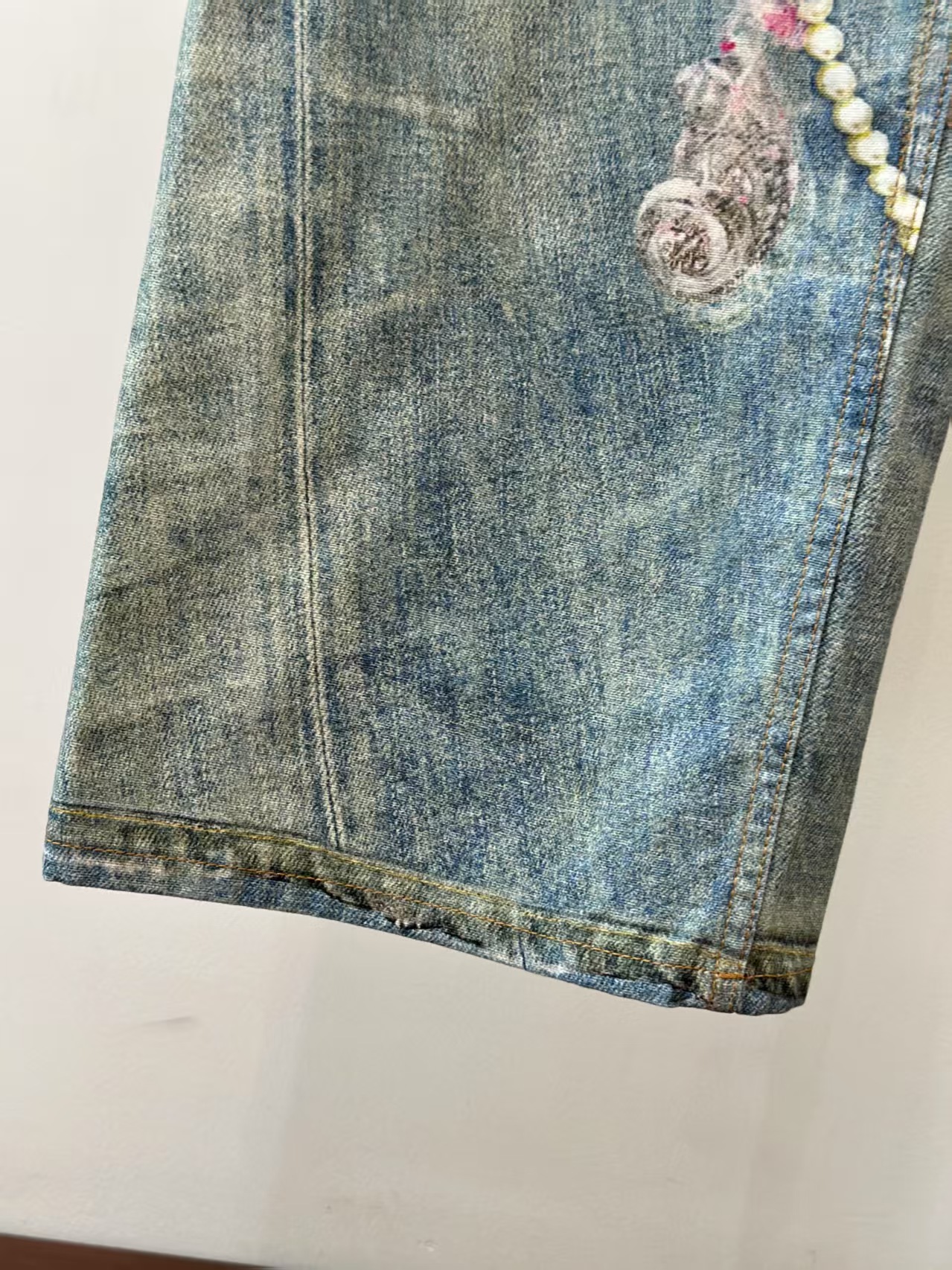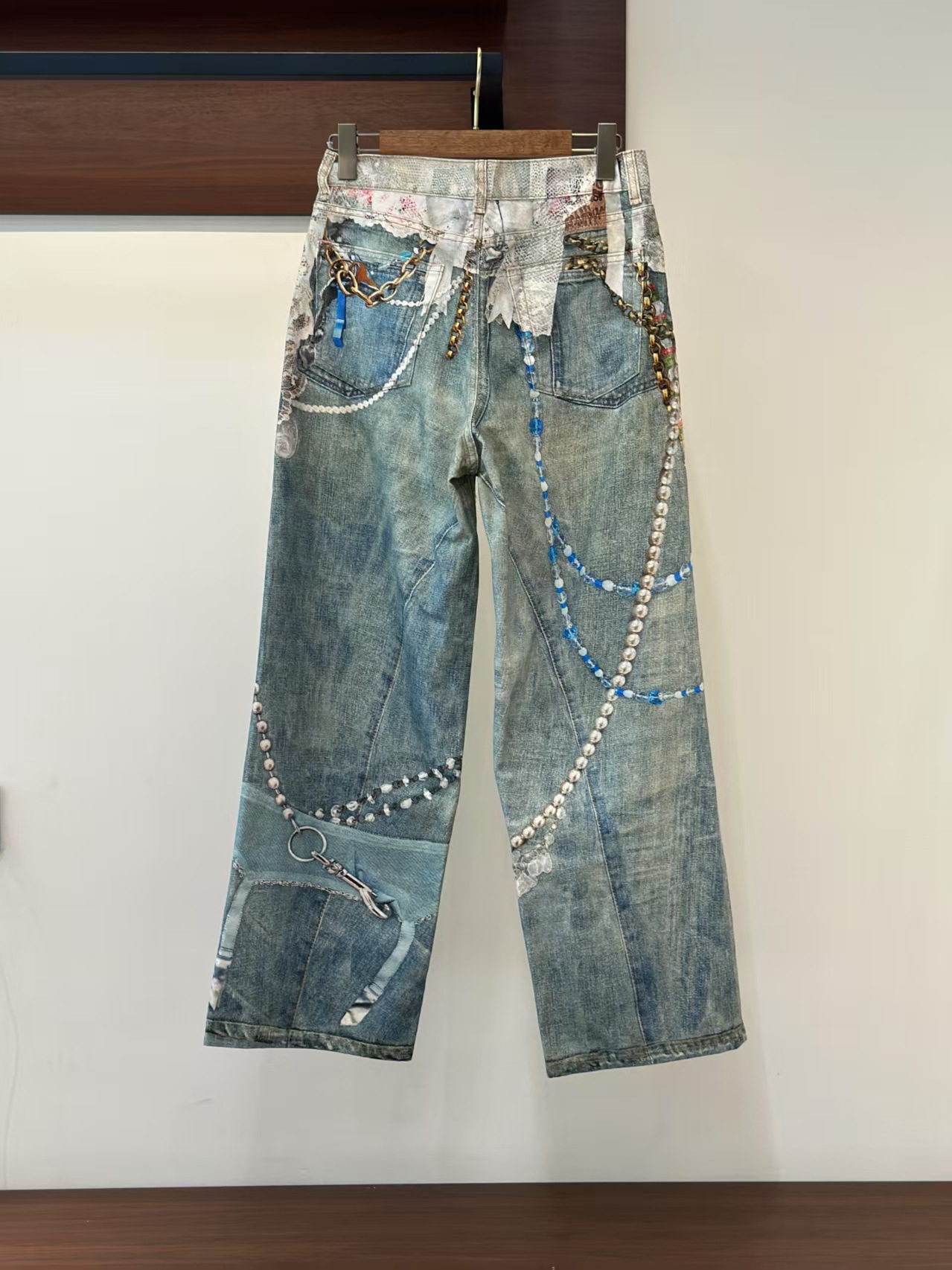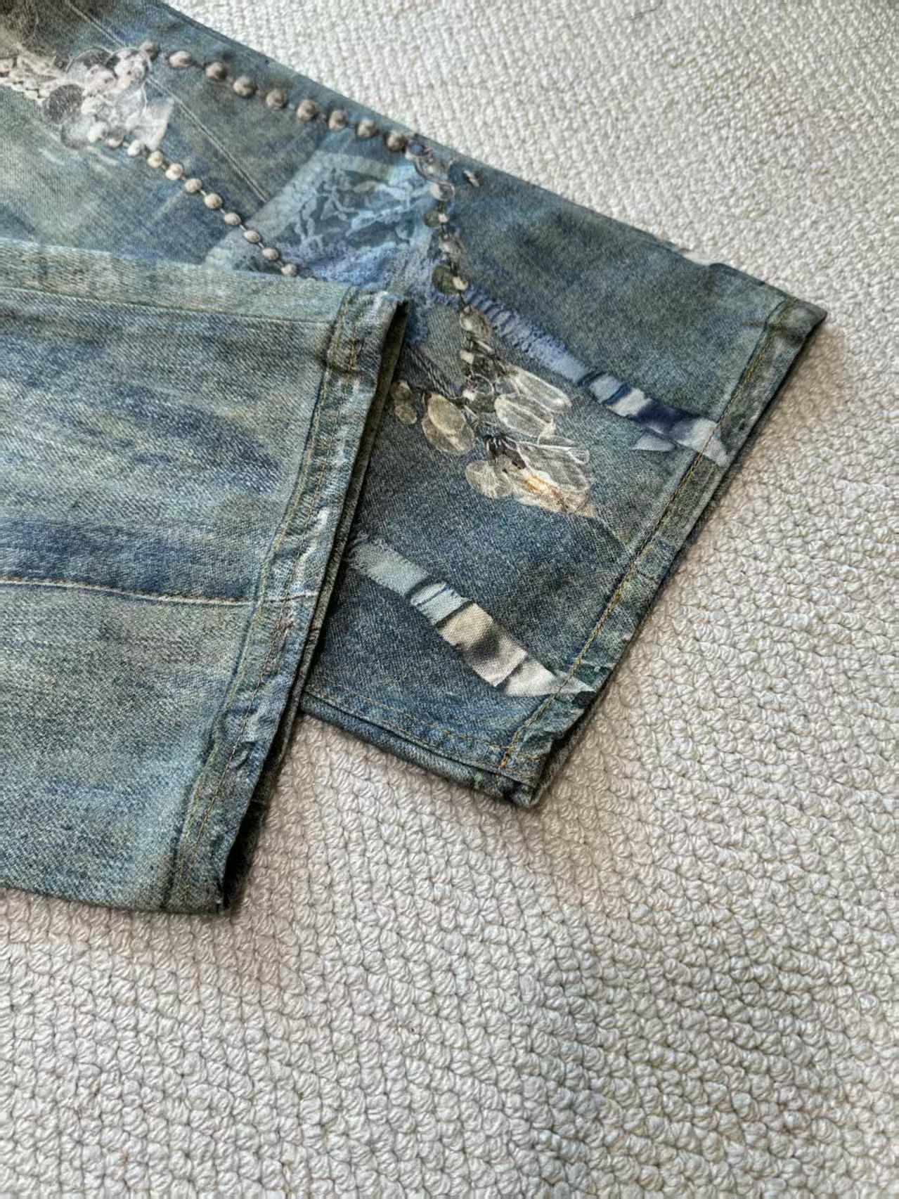 介绍:男女同款,1981系列牛仔裤 蕾丝珍珠链条3D印花宽松牛仔裤。整件由面布一共15片+2个口袋布是17片裁片组成,每块图案需单独对位印染 + 全手工对花拼接,确保图案在拼接处自然衔接,版型结构也完全按照原裤分块执行,做工极为考究。天花板品质 极致体验